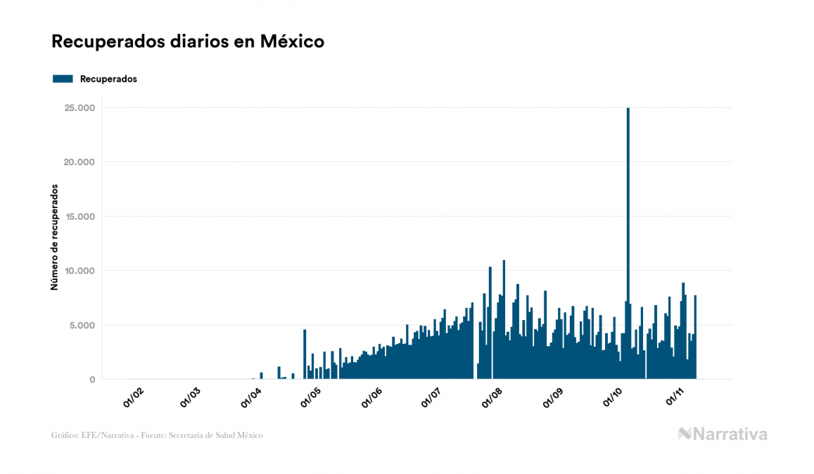 La COVID-19 deja ya 991.835 casos de contagio en México, con 158.582 de ellos actualmente activos y 97.056 fallecidos, según los últimos datos correspondientes al 13 de noviembre. Además, un total de 736.197 personas ya se ha recuperado desde que se produjo el primer contagio en el país.