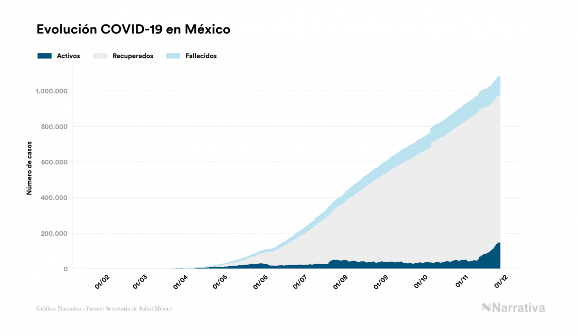El coronavirus deja ya 1.078.594 casos de contagio en México, con 170.771 de ellos actualmente activos y 104.242 fallecidos, según los últimos datos correspondientes al 27 de noviembre. Además, un total de 803.581 personas ya se ha recuperado desde que se produjo el primer contagio en el país.