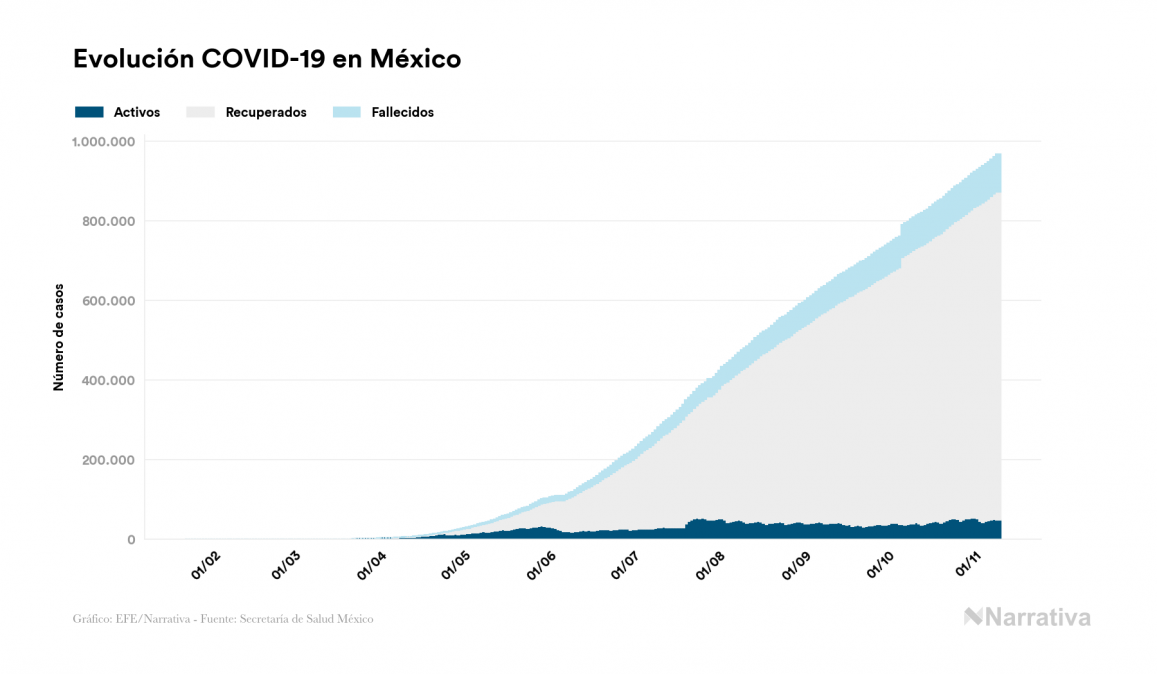 El coronavirus deja ya 967.825 casos de contagio en México, con 48.443 de ellos actualmente activos y 95.027 fallecidos, según los últimos datos correspondientes al 10 de noviembre. Además, un total de 824.355 personas ya se ha recuperado desde que se produjo el primer contagio en el país.