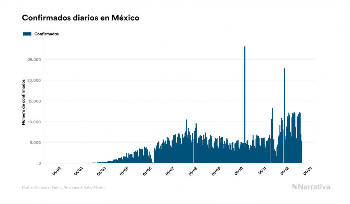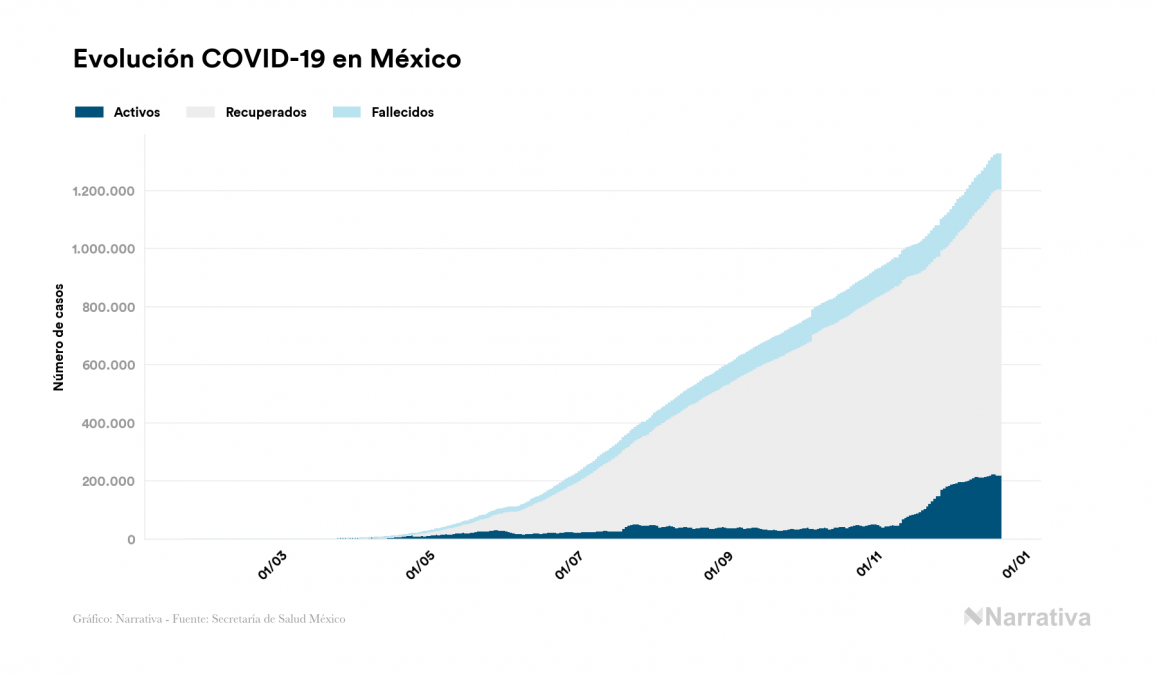 El nuevo coronavirus deja ya 1.325.915 casos de contagio en México, con 219.989 de ellos actualmente activos y 118.598 fallecidos, según los últimos datos correspondientes al 22 de diciembre. Además, un total de 987.328 personas ya se ha recuperado desde que se produjo el primer contagio en el país.