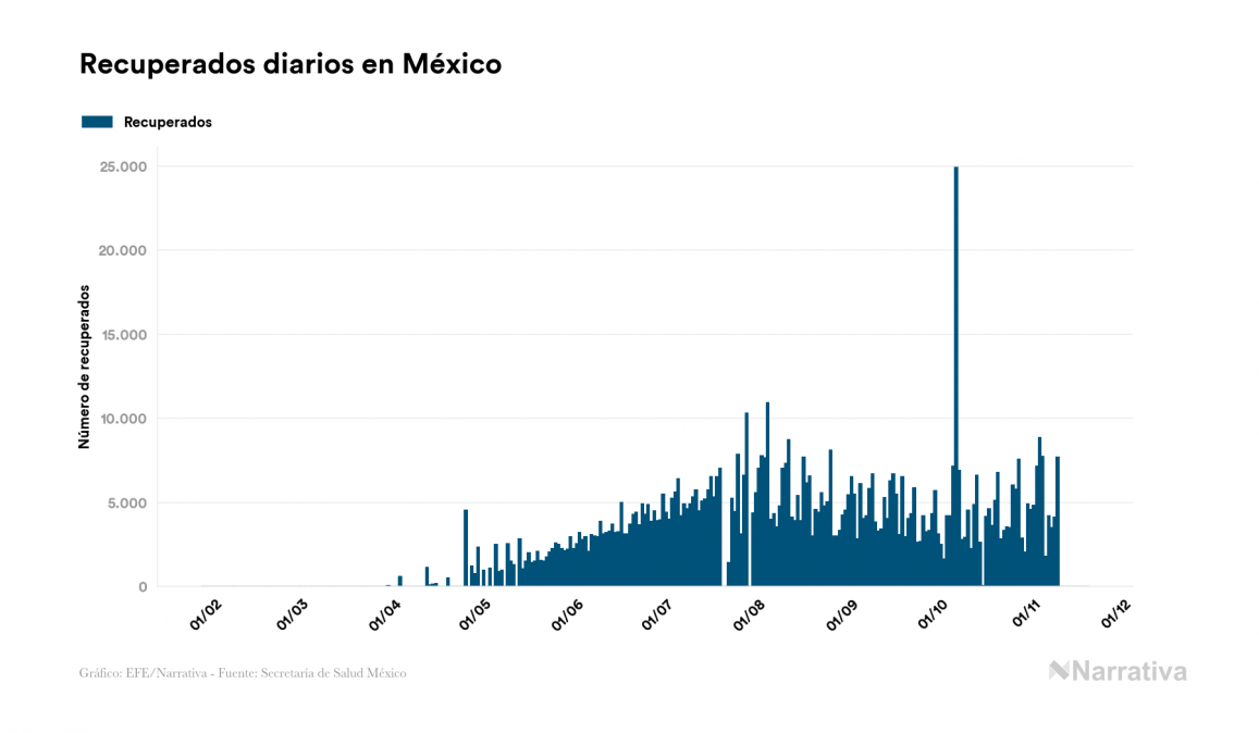 La COVID-19 deja ya 1.015.071 casos de contagio en México, con 153.518 de ellos actualmente activos y 99.528 fallecidos, según los últimos datos correspondientes al 19 de noviembre. Además, un total de 762.025 personas ya se ha recuperado desde que se produjo el primer contagio en el país.