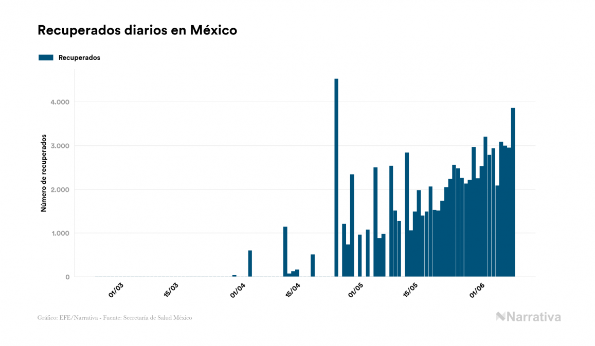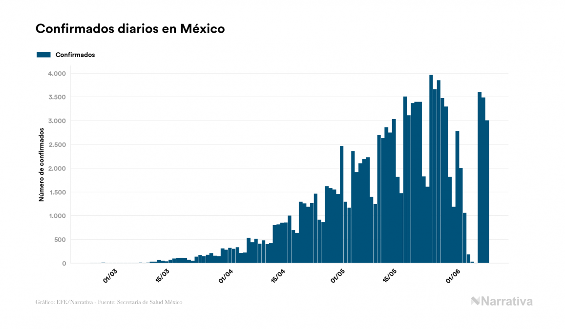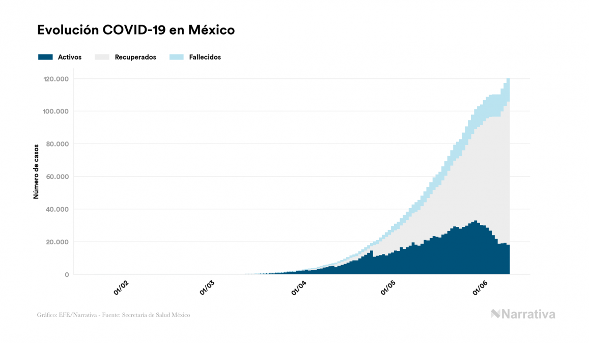 Según los últimos datos, actualmente en México hay 18.416 casos activos de COVID-19 tras confirmarse 2.999 nuevos positivos y 3.858 altas médicas este martes. Desde el comienzo de la pandemia, el número total de contagiados asciende a 120.102, con 87.633 recuperados y 14.053 fallecidos.