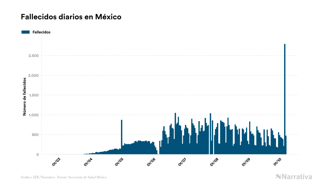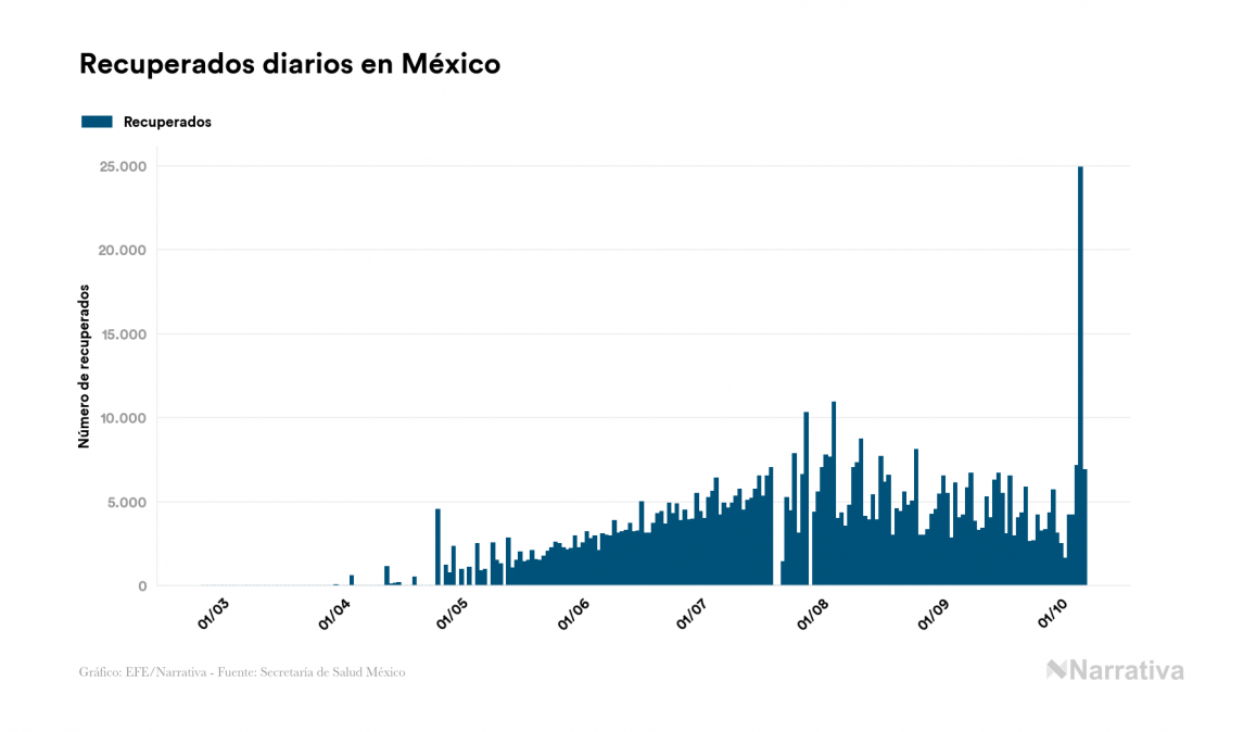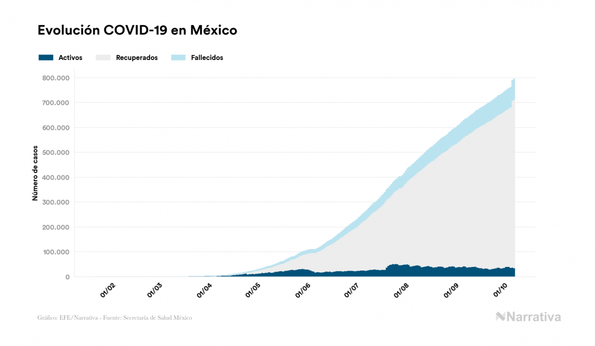 Según los últimos datos, México continúa con 35.337 casos activos de COVID-19 tras confirmarse 4.828 nuevos positivos y 6.889 altas médicas este miércoles. Desde el comienzo de la pandemia, el número total de contagiados asciende a 794.608, con 676.923 recuperados y 82.348 fallecidos.