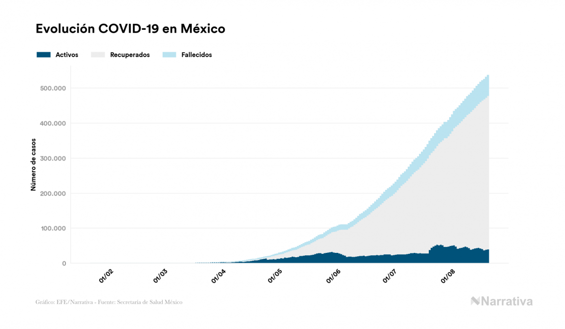 Según los últimos datos, México continúa con 40.175 casos activos de COVID-19 tras confirmarse 5.792 nuevos positivos y 4.566 altas médicas este jueves. Desde el comienzo de la pandemia, la cifra total de contagiados asciende a 537.031, con 438.375 recuperados y 58.481 fallecidos.