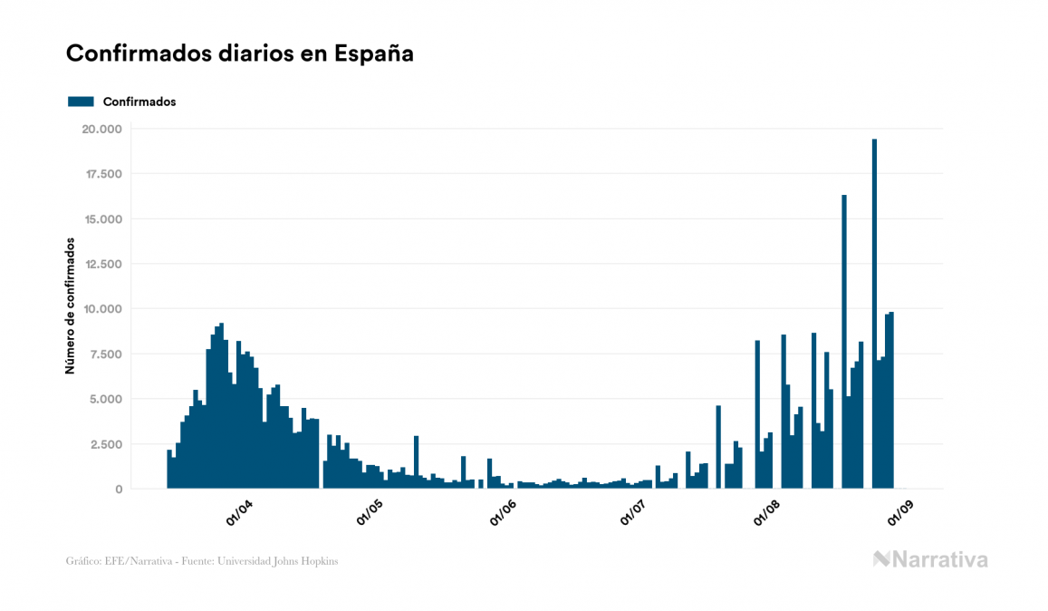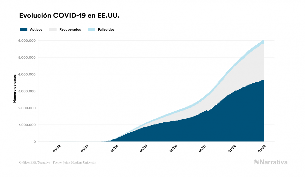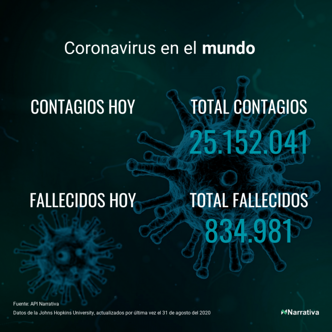 La cifra de casos por contagio por COVID-19 alcanza ya las 25.152.041 personas en todo el mundo, de las cuales ya se han recuperado 16.472.794. EE.UU. concentra el mayor número de casos con 5.997.163, seguido de Brasil, India y Rusia con 3.862.311, 3.621.245 y 992.402 casos cada uno.