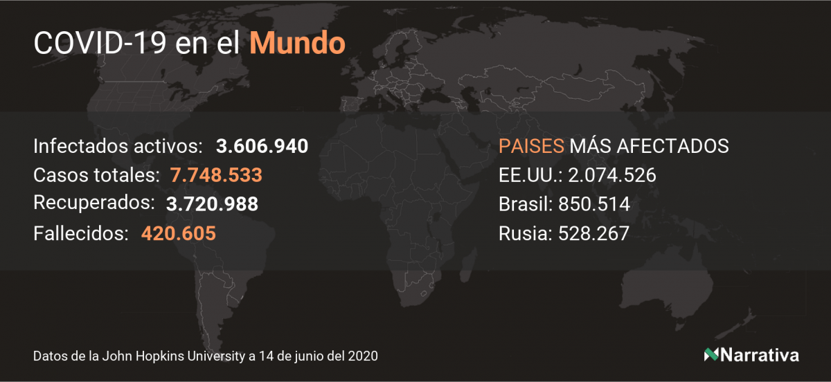 La cifra de casos por contagio por COVID-19 alcanza ya las 7.748.533 personas a nivel mundial, de las cuales 3.720.988 ya se han recuperado. EE.UU. concentra el mayor número de casos con 2.074.526, seguido de Brasil, Rusia y India con 850.514, 528.267 y 321.630 casos respectivamente.