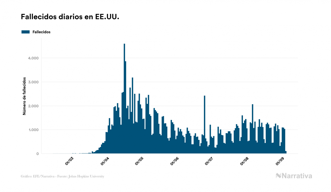 Desde su aparición, el balance global de fallecidos por coronavirus a nivel mundial es de 857.394 personas, a las que se suman 1.324 desde el último recuento de víctimas. EE.UU. es el país que ha registrado una mayor cantidad hasta el momento con 186.798 muertes, seguido de Brasil, India y México con 124.614, 68.580 y 66.329 fallecimientos respectivamente.