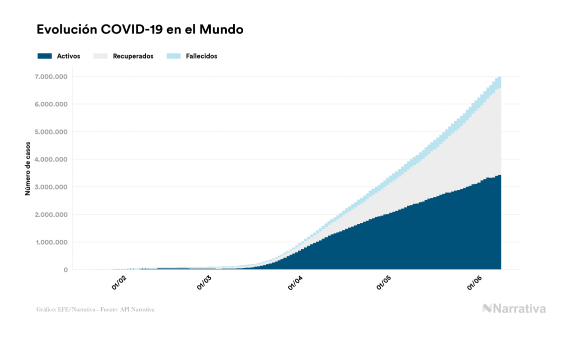 El número de casos confirmados de contagio por COVID-19 alcanza ya las 6.973.972 personas a nivel mundial, de las cuales ya se han recuperado 3.149.217. EE.UU. concentra el mayor número de casos con 1.942.363, seguido de Brasil, Rusia y Reino Unido con 691.758, 476.043 y 287.621 casos respectivamente.