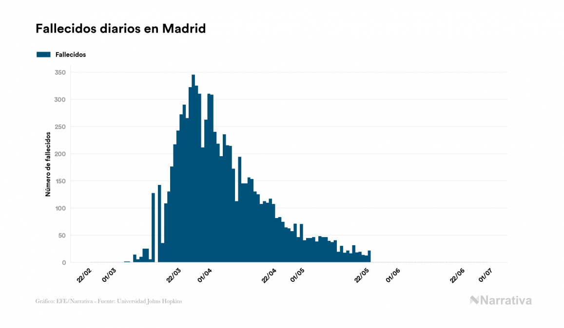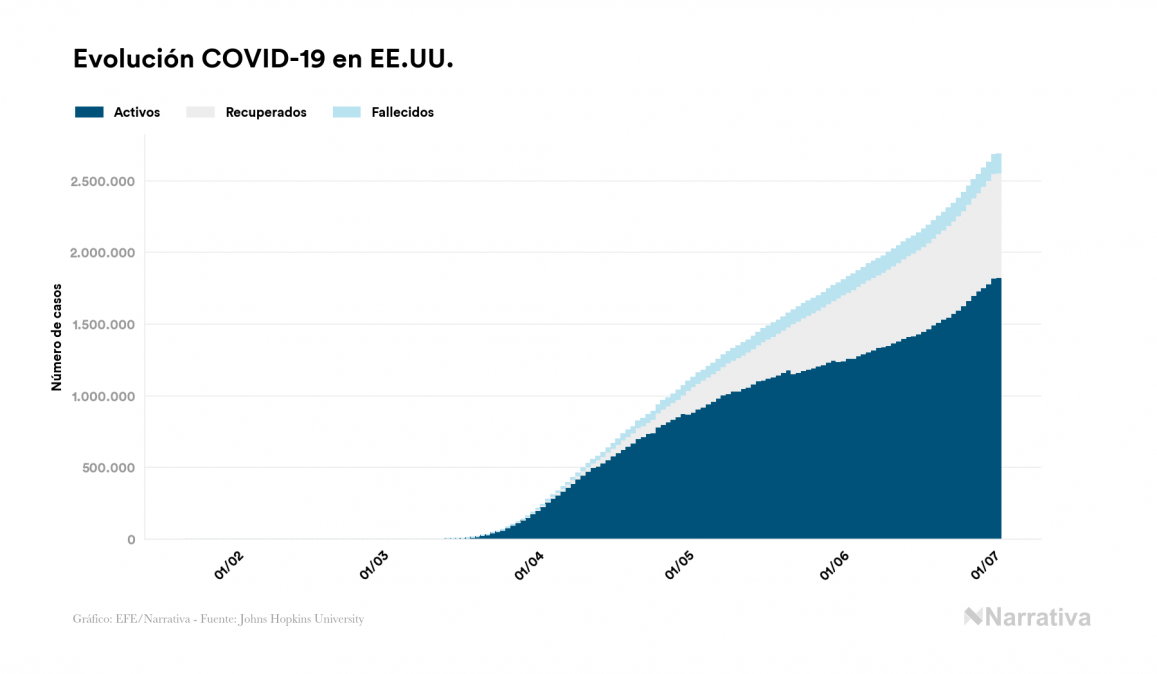 Desde su aparición, el número de fallecidos a nivel mundial se sitúa actualmente en 505.509 personas, a las que se han sumado 1.543 desde el último recuento de víctimas. EE.UU. es el país que ha registrado una mayor cantidad hasta el momento con 128.062 personas fallecidas, seguido de Brasil, Reino Unido e Italia con 60.632, 43.991 y 34.788 fallecimientos respectivamente.
