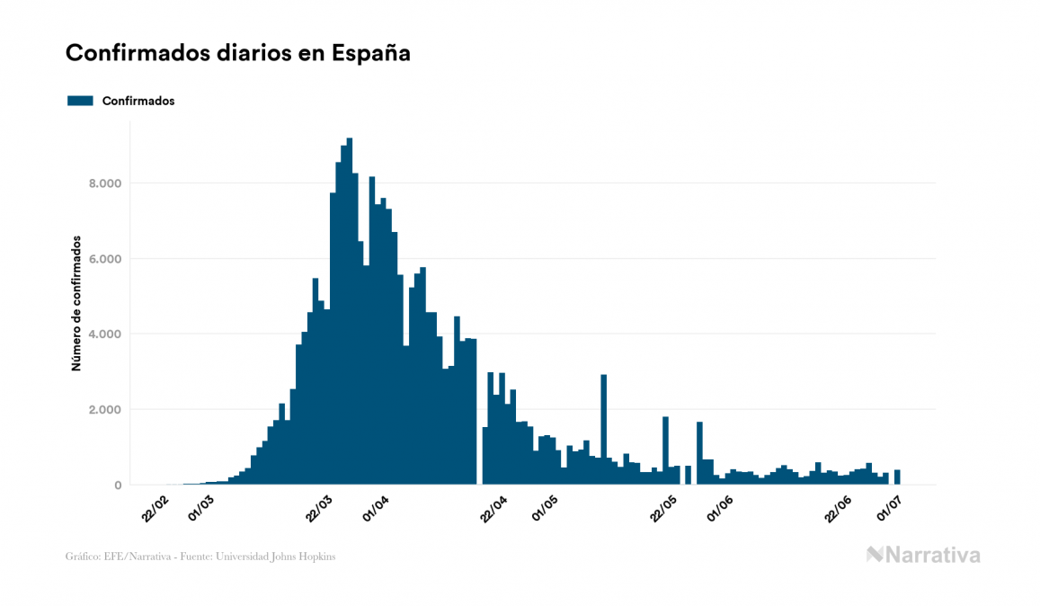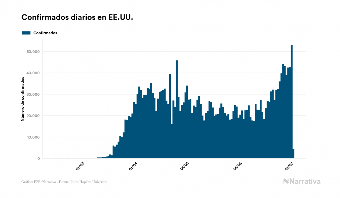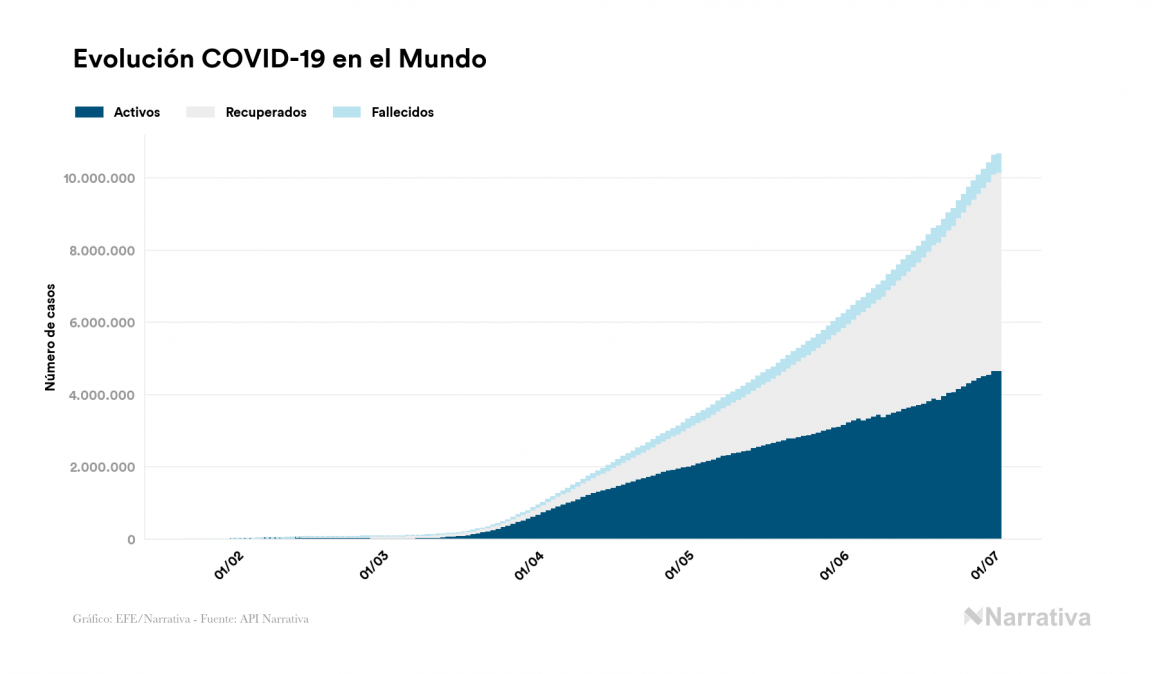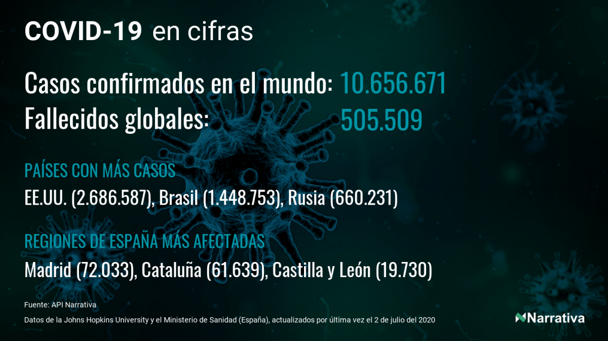 El número de casos confirmados de contagio por COVID-19 alcanza ya las 10.656.671 personas en todo el mundo, de las cuales ya se han recuperado 5.492.652. EE.UU. concentra el mayor número de casos con 2.686.587, seguido de Brasil, Rusia y India con 1.448.753, 660.231 y 605.118 casos cada uno.