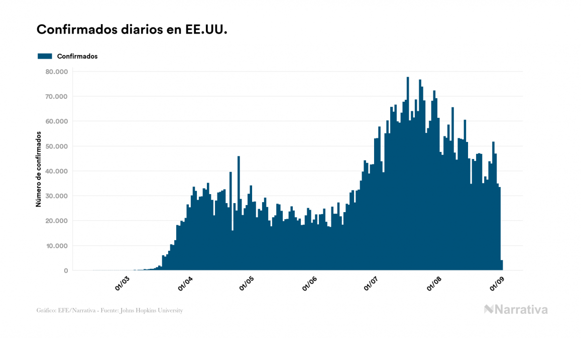Desde su aparición, el número de fallecidos a nivel mundial se sitúa actualmente en 839.203 personas, tras sumarse 1.546 nuevas muertes en el último recuento. EE.UU. es el país que ha registrado una mayor cantidad hasta el momento con 183.601 personas fallecidas, seguido de Brasil, India y México con 121.381, 65.444 y 64.414 fallecimientos respectivamente.