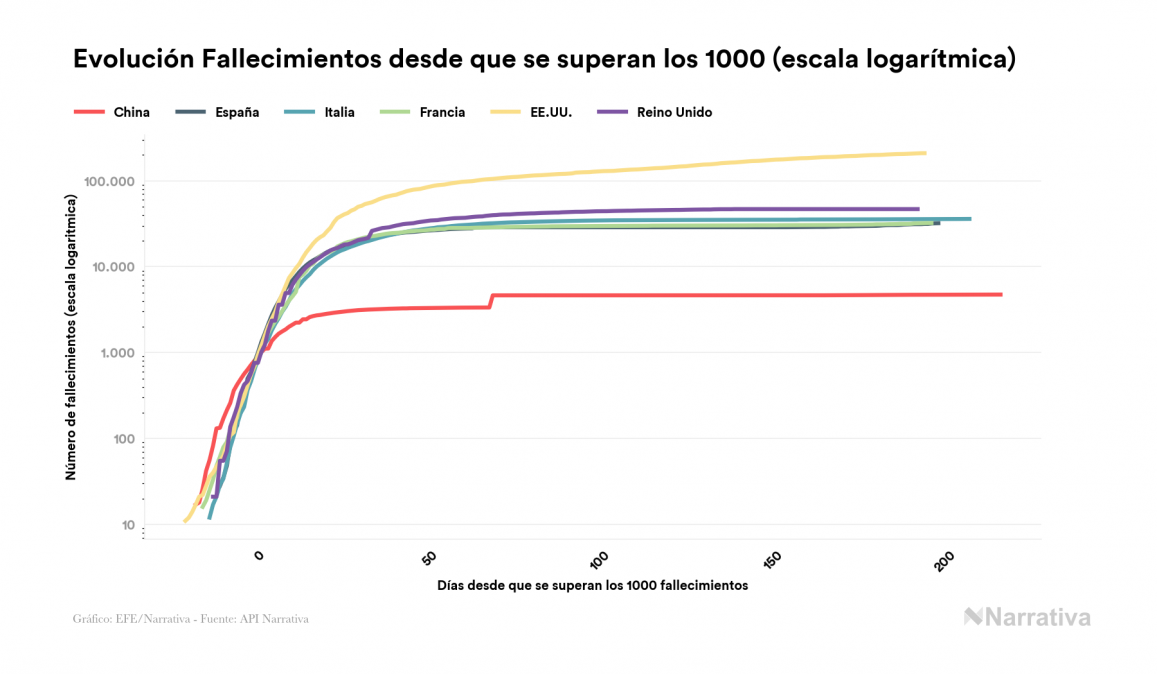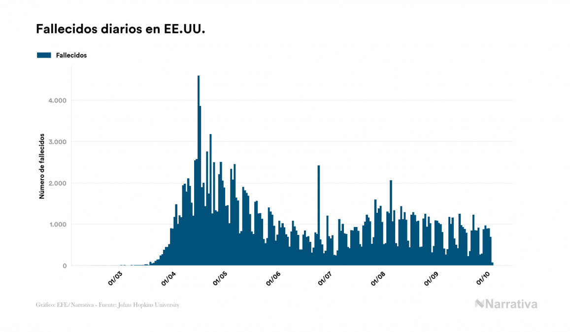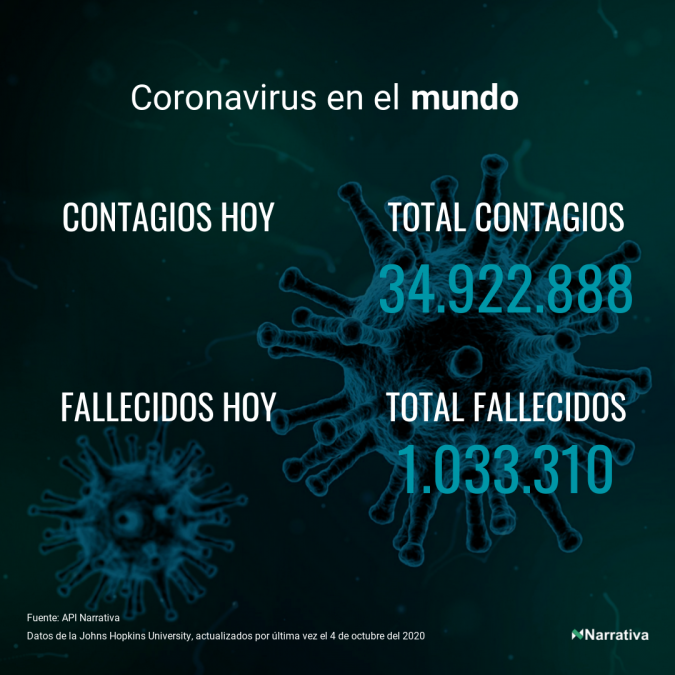 Desde su aparición, el balance global de fallecidos por coronavirus a nivel mundial es de 1.033.310 personas, a las que se han sumado 1.976 desde el último recuento de víctimas. EE.UU. es el país con mayor número de víctimas hasta el momento con 209.394 personas fallecidas, seguido de Brasil, India y México con 145.987, 101.782 y 78.880 fallecimientos respectivamente.