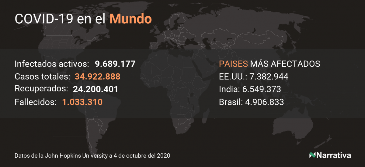 El número de casos confirmados de contagio por COVID-19 alcanza ya las 34.922.888 personas en todo el mundo, de las cuales ya se han recuperado 24.200.401. EE.UU. concentra el mayor número de casos con 7.382.944, seguido de India, Brasil y Rusia con 6.549.373, 4.906.833 y 1.209.039 casos cada uno.