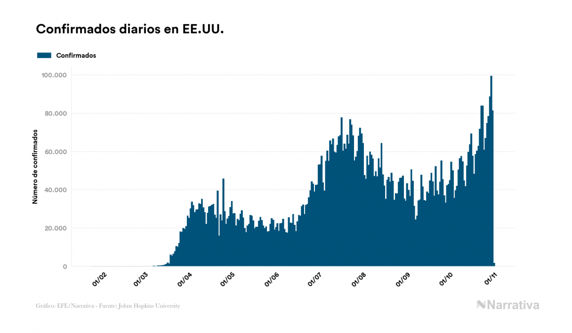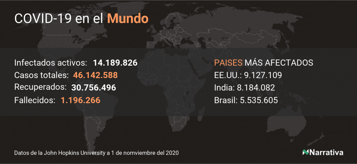 El número de casos confirmados de contagio por COVID-19 alcanza ya las 46.142.588 personas a nivel mundial, de las cuales ya se han recuperado 30.756.496. EE.UU. concentra el mayor número de casos con 9.127.109, seguido de India, Brasil y Rusia con 8.184.082, 5.535.605 y 1.624.648 casos cada uno.