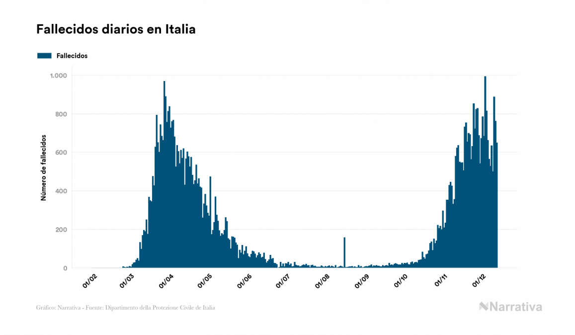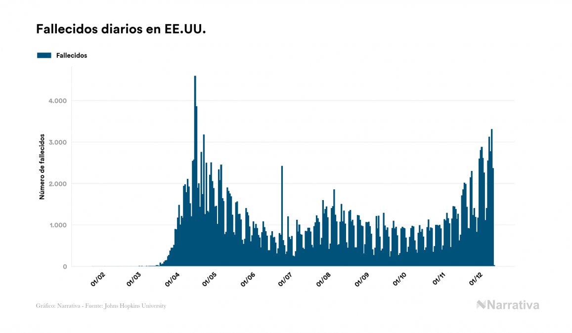 Desde su aparición, el número de fallecidos a nivel mundial se sitúa actualmente en 1.606.686 personas, tras sumarse 3.131 nuevas muertes en el último informe. EE.UU. es el país con mayor número de víctimas hasta el momento con 297.843 muertes, seguido de Brasil, India y México con 181.123, 143.019 y 113.704 fallecimientos respectivamente.