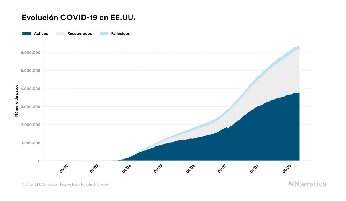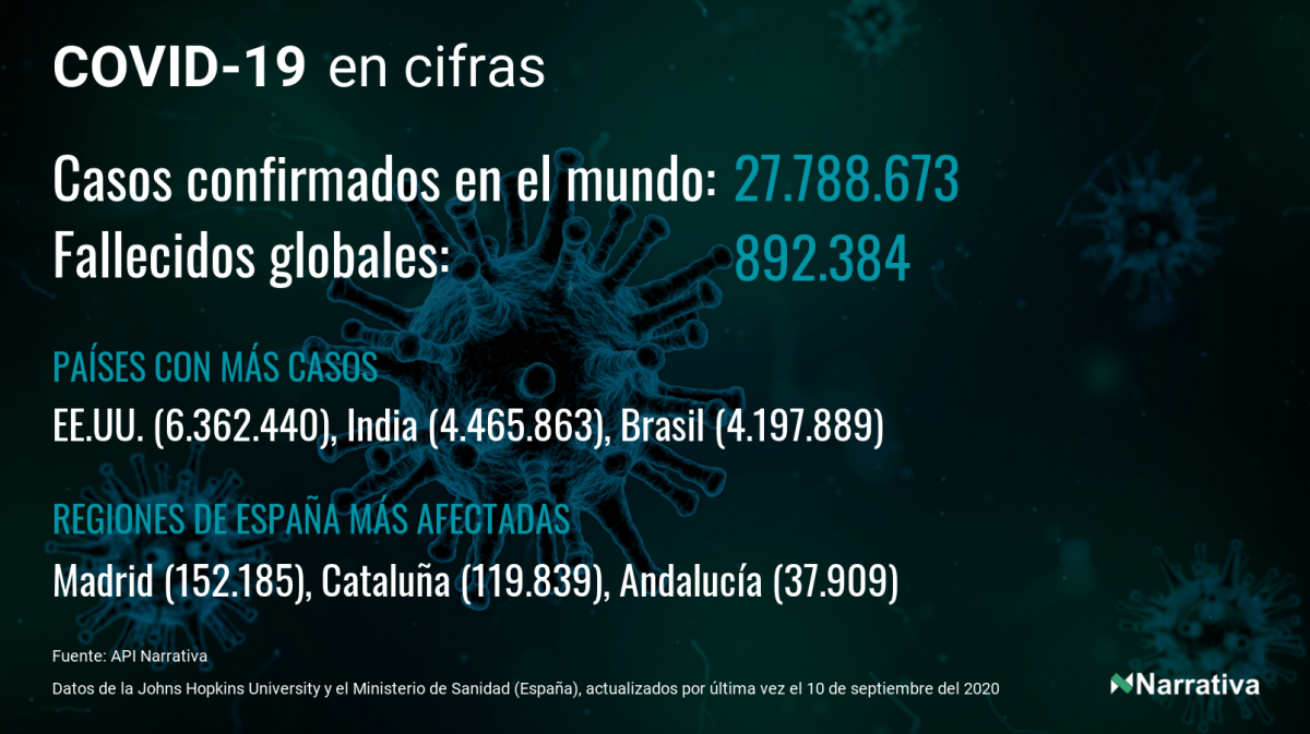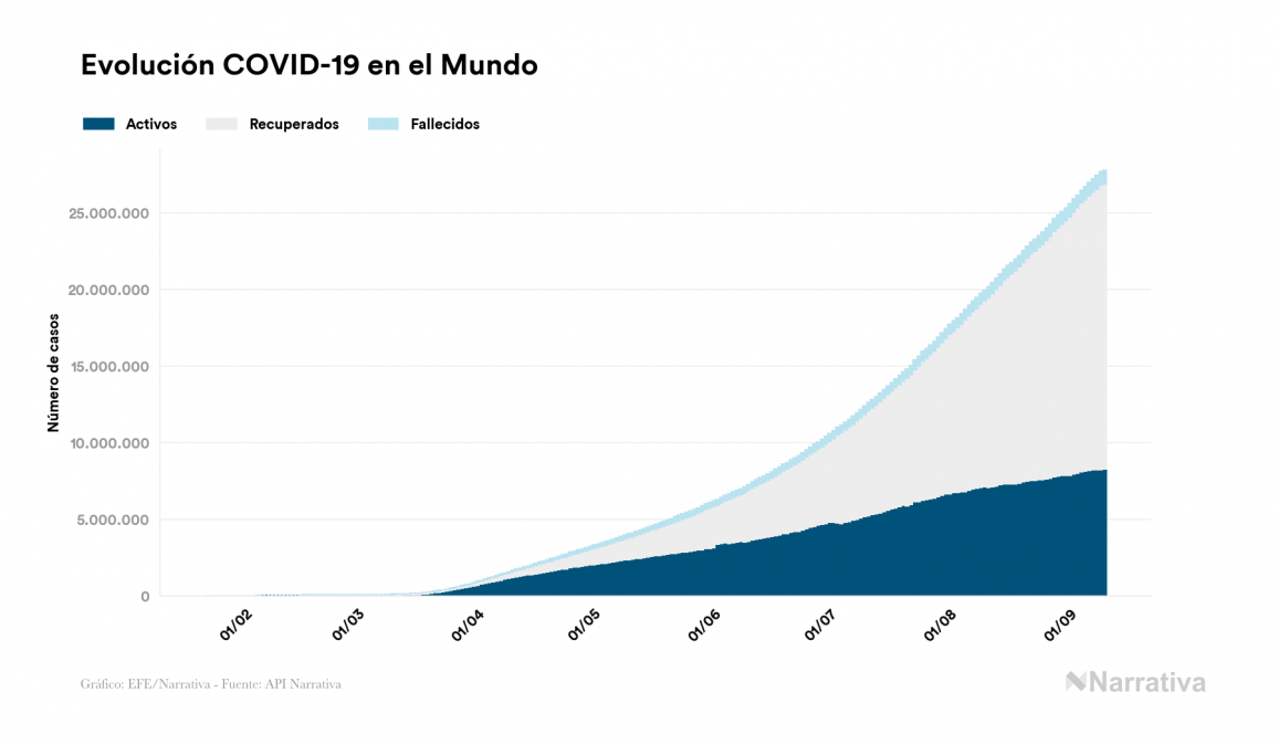 El número de casos confirmados de contagio por COVID-19 alcanza ya las 27.788.673 personas a nivel mundial, de las cuales ya se han recuperado 18.631.781. EE.UU. concentra el mayor número de casos con 6.362.440, seguido de India, Brasil y Rusia con 4.465.863, 4.197.889 y 1.042.836 casos respectivamente.