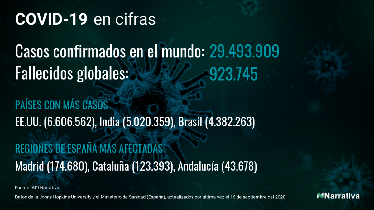 La cifra de casos por contagio por COVID-19 alcanza ya las 29.493.909 personas en todo el mundo, de las cuales ya se han recuperado 19.930.888. EE.UU. concentra el mayor número de casos con 6.606.562, seguido de India, Brasil y Rusia con 5.020.359, 4.382.263 y 1.075.485 casos respectivamente.