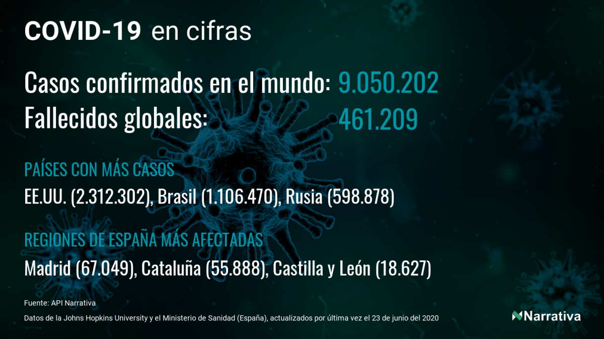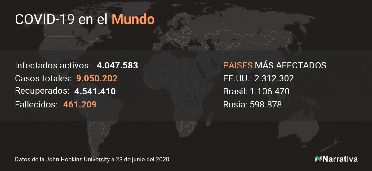 La cifra de casos por contagio por COVID-19 alcanza ya las 9.050.202 personas en todo el mundo, de las cuales ya se han recuperado 4.541.410. EE.UU. concentra el mayor número de casos con 2.312.302, seguido de Brasil, Rusia y India con 1.106.470, 598.878 y 440.345 casos respectivamente.