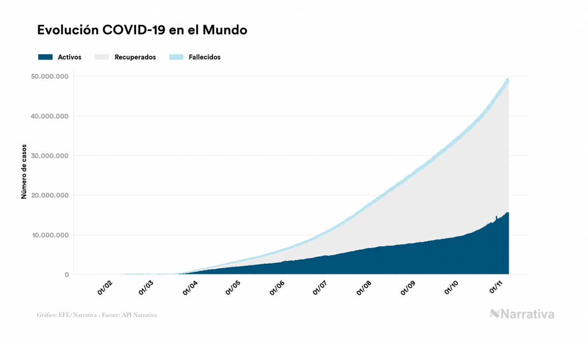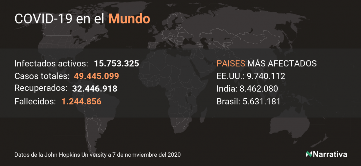 La cifra de casos por contagio por COVID-19 alcanza ya las 49.445.099 personas a nivel mundial, de las cuales ya se han recuperado 32.446.918. EE.UU. concentra el mayor número de casos con 9.740.112, seguido de India, Brasil y Rusia con 8.462.080, 5.631.181 y 1.740.172 casos cada uno.