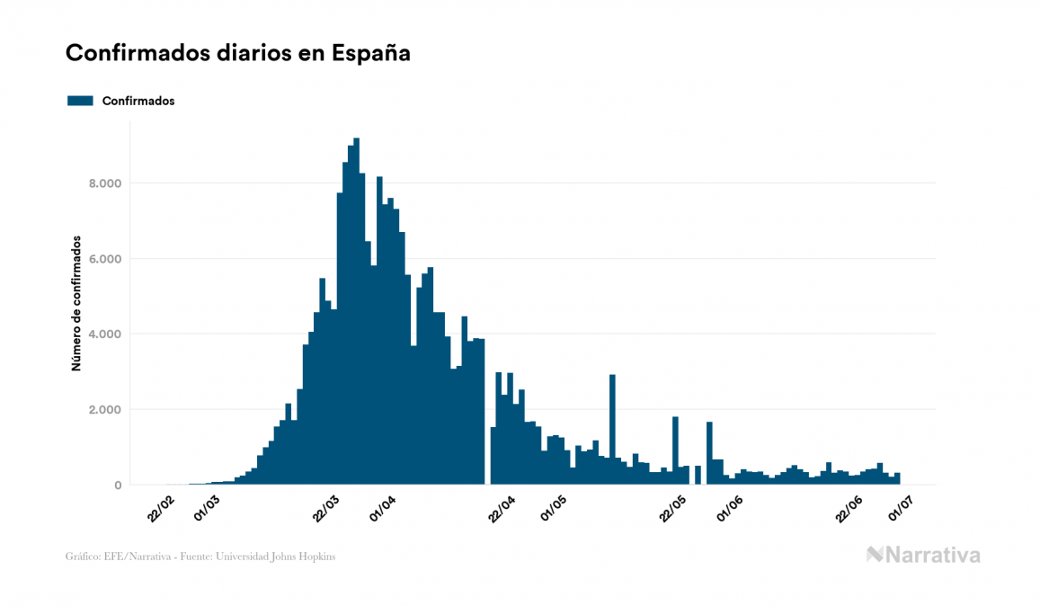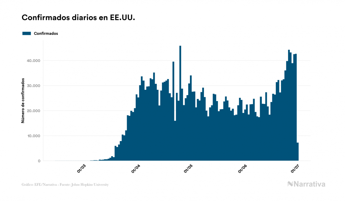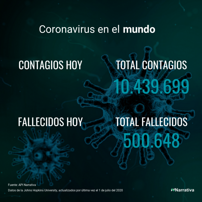 El número de casos confirmados de contagio por COVID-19 alcanza ya las 10.439.699 personas en todo el mundo, de las cuales ya se han recuperado 5.368.051. EE.UU. concentra el mayor número de casos con 2.636.538, seguido de Brasil, Rusia y India con 1.402.041, 653.479 y 585.689 casos respectivamente.