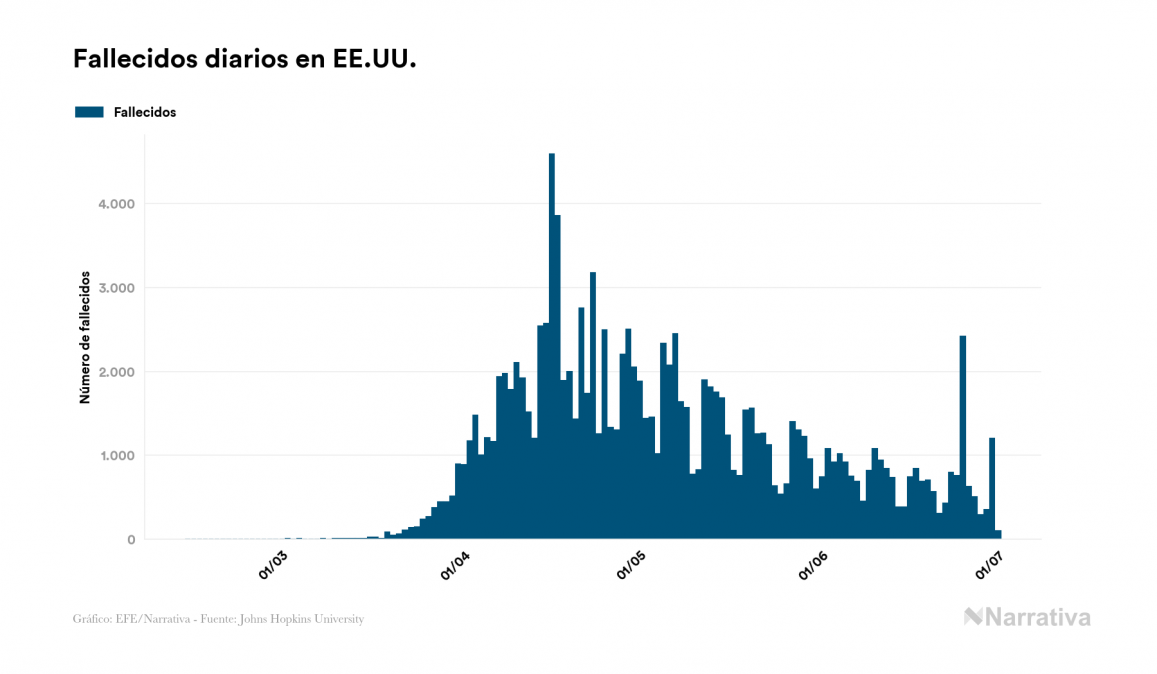 Desde su aparición, el número de fallecidos a nivel mundial se sitúa actualmente en 500.648 personas, tras sumarse 1.535 nuevas muertes en el último recuento. EE.UU. es el país que ha registrado una mayor cantidad hasta el momento con 127.425 muertes, seguido de Brasil, Reino Unido e Italia con 59.594, 43.815 y 34.767 fallecimientos respectivamente.