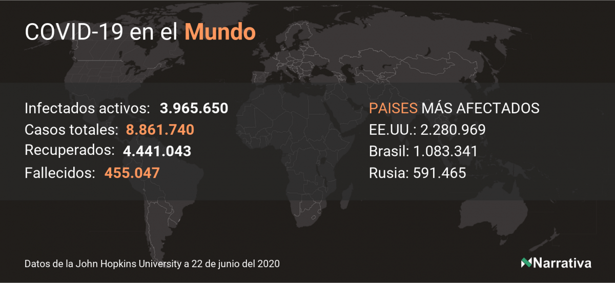 El número de casos confirmados de contagio por COVID-19 alcanza ya las 8.861.740 personas a nivel mundial, de las cuales ya se han recuperado 4.441.043. EE.UU. concentra el mayor número de casos con 2.280.969, seguido de Brasil, Rusia y India con 1.083.341, 591.465 y 426.787 casos respectivamente.