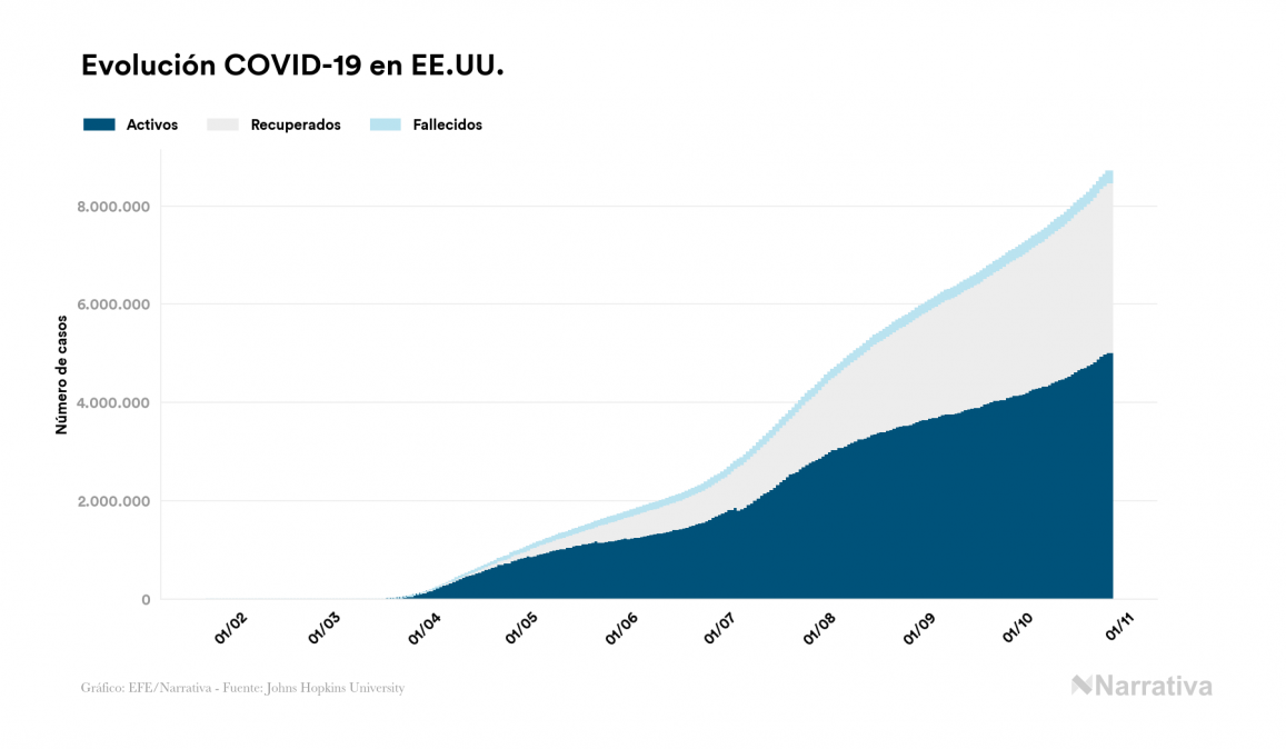 El número de casos confirmados de contagio por COVID-19 alcanza ya las 43.561.056 personas en todo el mundo, de las cuales ya se han recuperado 29.108.575. EE.UU. concentra el mayor número de casos con 8.704.968, seguido de India, Brasil y Rusia con 7.946.429, 5.409.854 y 1.537.142 casos respectivamente.