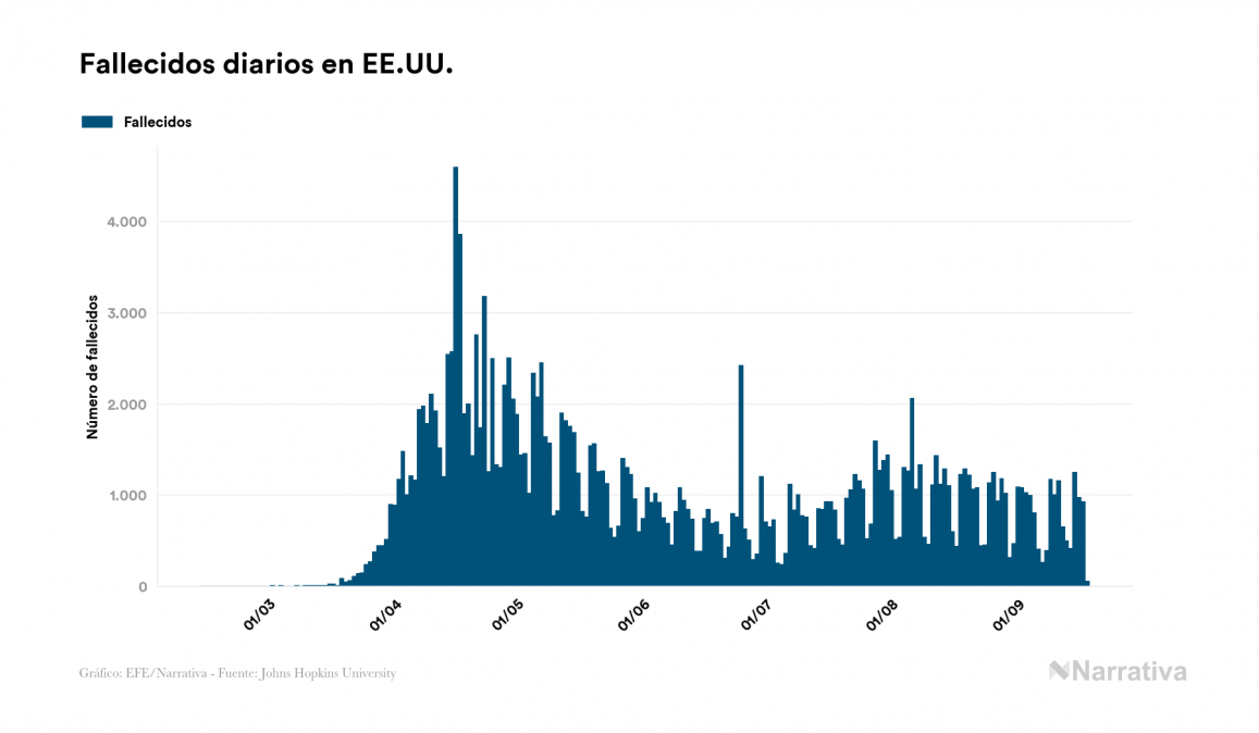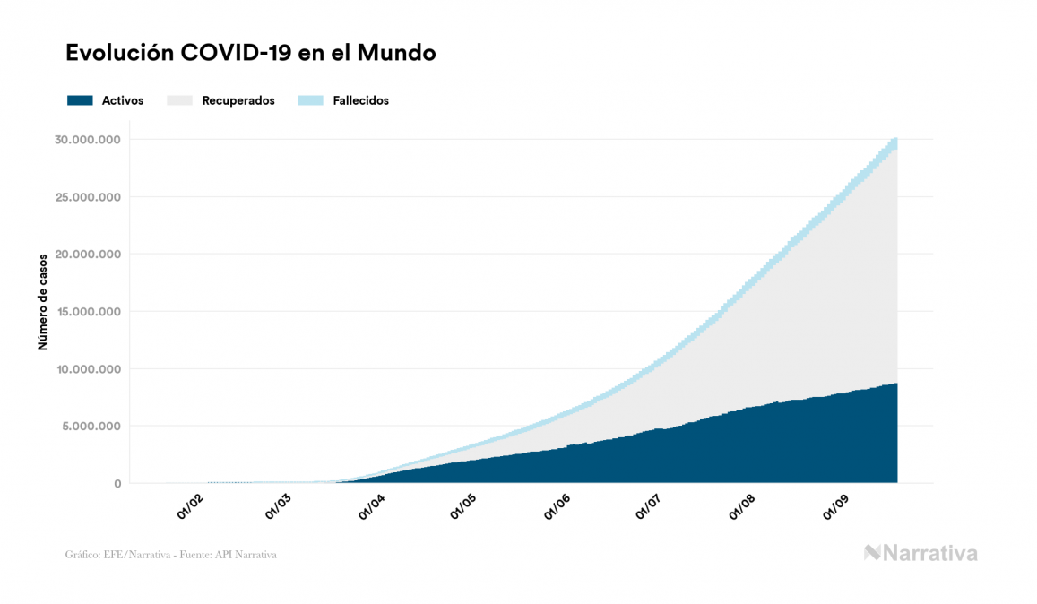 El número de casos confirmados de contagio por COVID-19 alcanza ya las 30.092.513 personas en todo el mundo, de las cuales 20.379.314 ya se han recuperado. EE.UU. concentra el mayor número de casos con 6.675.593, seguido de India, Brasil y Rusia con 5.214.677, 4.455.386 y 1.086.955 casos cada uno.