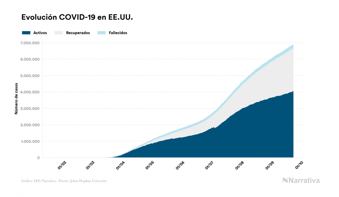 En total, el balance global de fallecidos por coronavirus a nivel mundial es de 953.269 personas, a las que se suman 2.544 desde el último informe. EE.UU. es el país que ha registrado una mayor cantidad hasta el momento con 199.886 personas fallecidas, seguido de Brasil, India y México con 137.272, 88.935 y 73.697 fallecimientos respectivamente.
