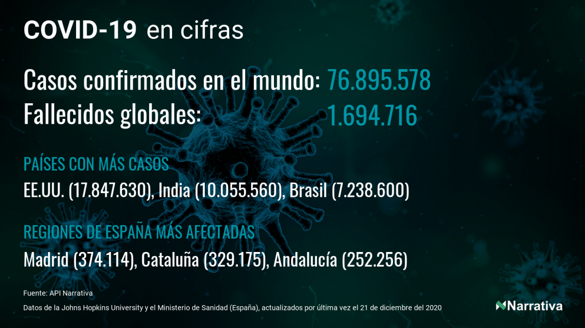 La cifra de casos por contagio por COVID-19 alcanza ya las 76.895.578 personas a nivel mundial, de las cuales 50.204.321 ya se han recuperado. EE.UU. concentra el mayor número de casos con 17.847.630, seguido de India, Brasil y Rusia con 10.055.560, 7.238.600 y 2.850.042 casos respectivamente.
