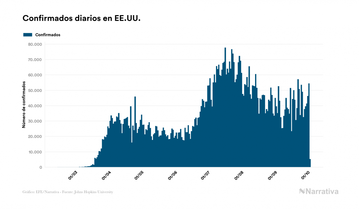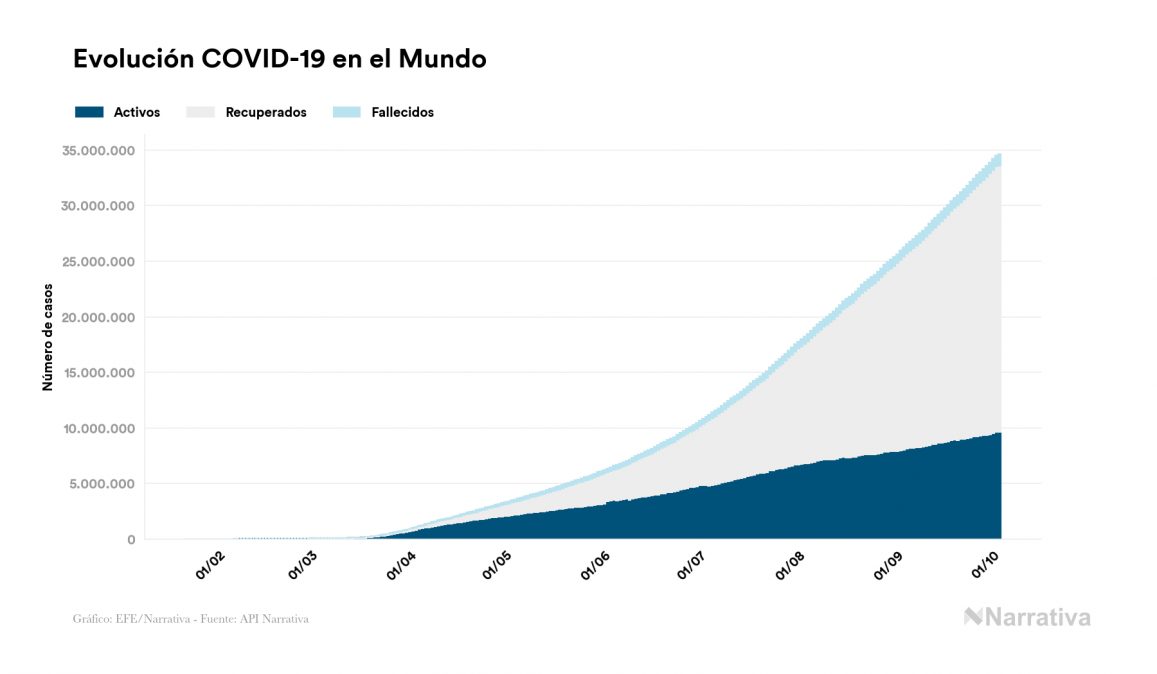 El número de casos confirmados de contagio por COVID-19 alcanza ya las 34.644.515 personas en todo el mundo, de las cuales 23.950.125 ya se han recuperado. EE.UU. concentra el mayor número de casos con 7.333.426, seguido de India, Brasil y Rusia con 6.473.544, 4.880.523 y 1.198.663 casos respectivamente.