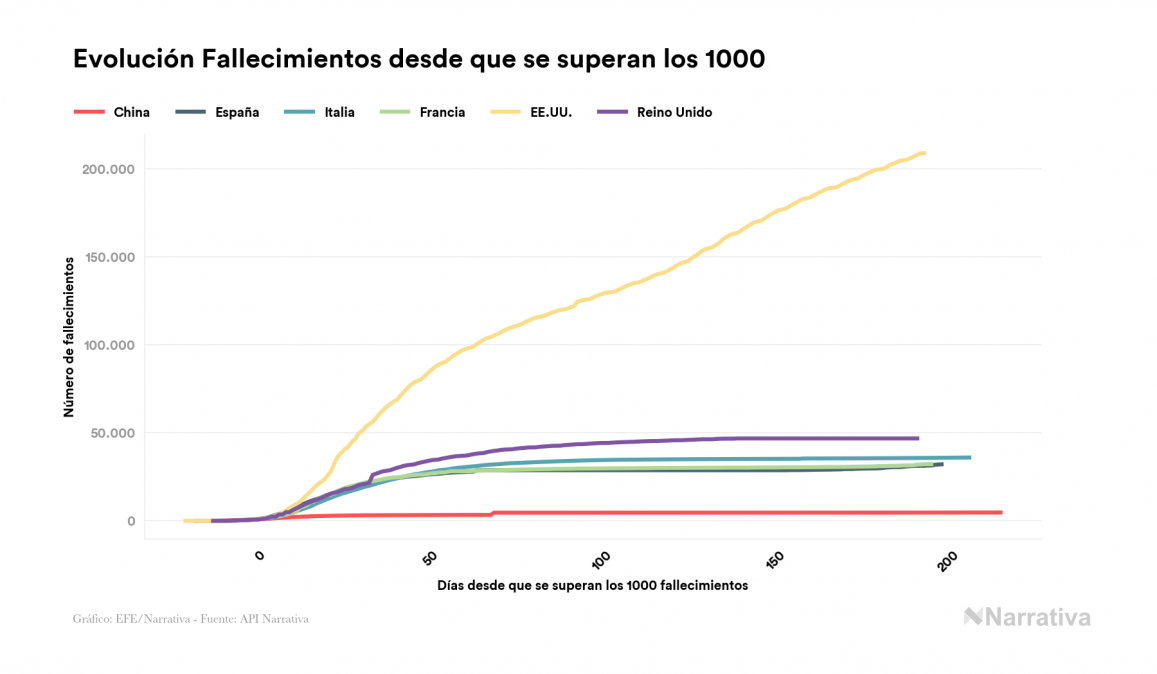 En total, el número de fallecidos a nivel mundial se sitúa actualmente en 1.029.055 personas, a las que se suman 2.871 desde el último informe. EE.UU. es el país que ha registrado una mayor cantidad hasta el momento con 208.723 personas fallecidas, seguido de Brasil, India y México con 145.388, 100.842 y 78.492 fallecimientos respectivamente.