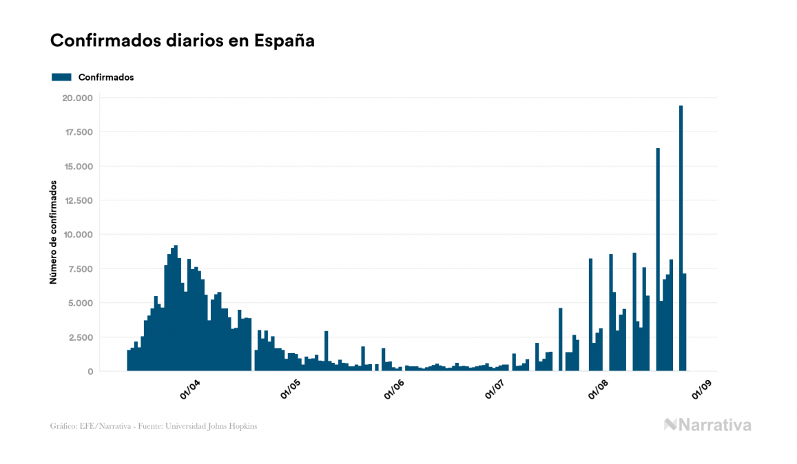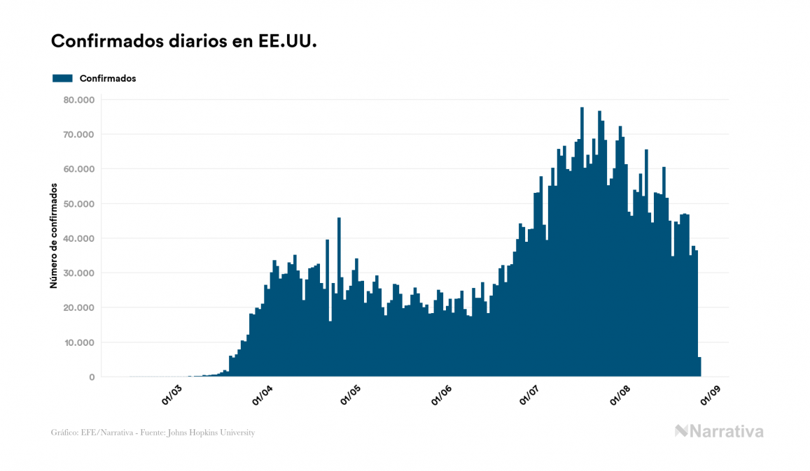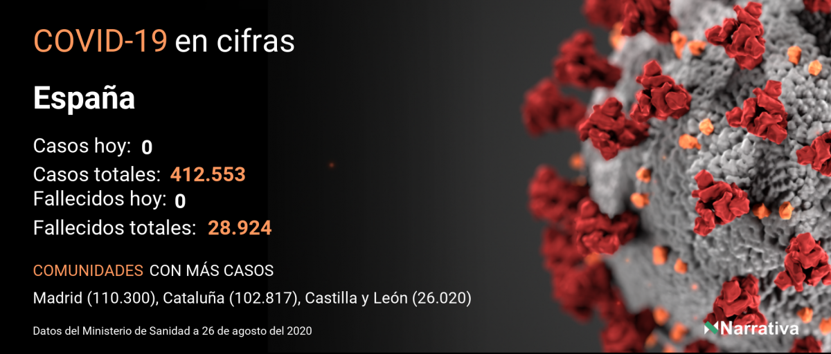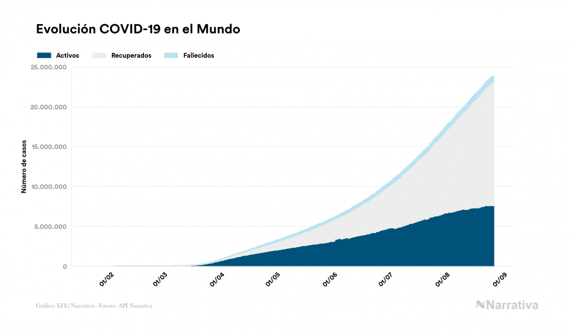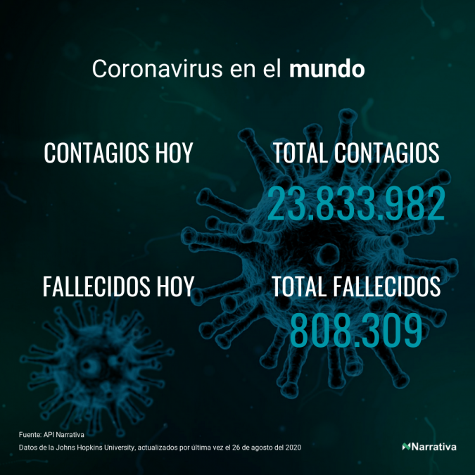 La cifra de casos por contagio por COVID-19 alcanza ya las 23.833.982 personas a nivel mundial, de las cuales ya se han recuperado 15.444.833. EE.UU. concentra el mayor número de casos con 5.779.371, seguido de Brasil, India y Rusia con 3.669.995, 3.234.474 y 968.297 casos respectivamente.