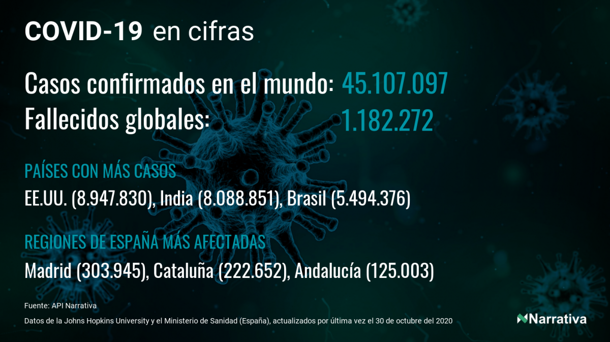 El número de casos confirmados de contagio por COVID-19 alcanza ya las 45.107.097 personas a nivel mundial, de las cuales 30.217.768 ya se han recuperado. EE.UU. concentra el mayor número de casos con 8.947.830, seguido de India, Brasil y Rusia con 8.088.851, 5.494.376 y 1.588.433 casos cada uno.