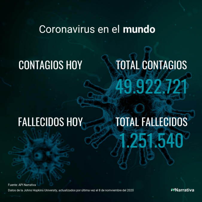 El número de casos confirmados de contagio por COVID-19 alcanza ya las 49.922.721 personas en todo el mundo, de las cuales 32.716.205 ya se han recuperado. EE.UU. concentra el mayor número de casos con 9.861.898, seguido de India, Brasil y Rusia con 8.507.754, 5.653.561 y 1.760.420 casos cada uno.
