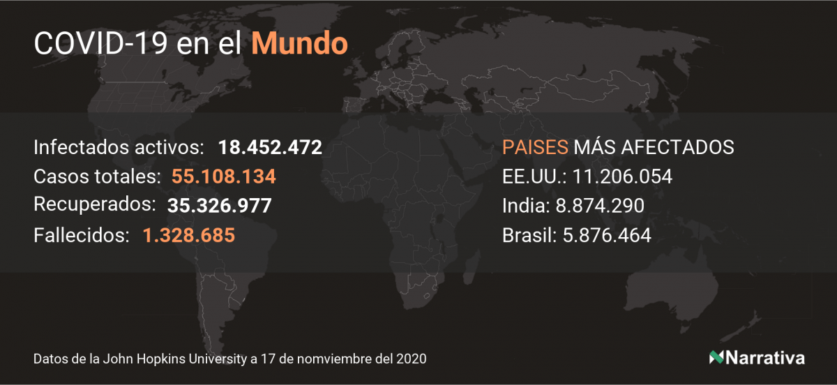 El número de casos confirmados de contagio por COVID-19 alcanza ya las 55.108.134 personas en todo el mundo, de las cuales ya se han recuperado 35.326.977. EE.UU. concentra el mayor número de casos con 11.206.054, seguido de India, Brasil y Francia con 8.874.290, 5.876.464 y 2.041.293 casos cada uno.