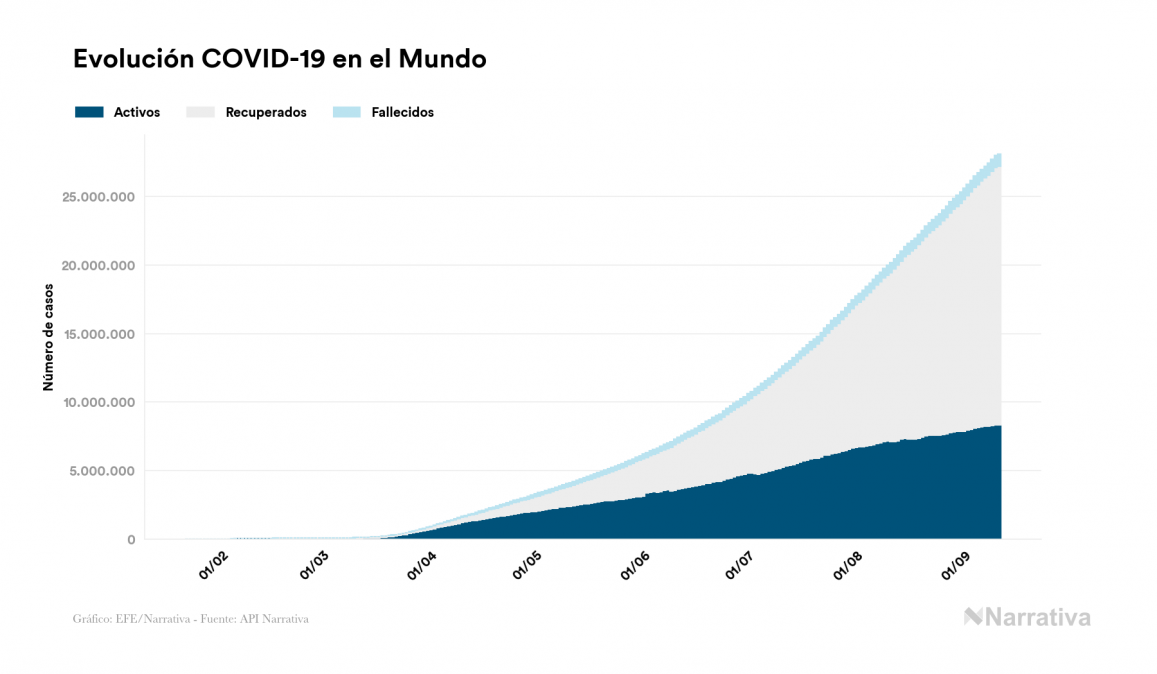 El número de casos confirmados de contagio por COVID-19 alcanza ya las 28.092.755 personas a nivel mundial, de las cuales ya se han recuperado 18.855.517. EE.UU. concentra el mayor número de casos con 6.397.244, seguido de India, Brasil y Rusia con 4.562.414, 4.238.446 y 1.048.257 casos cada uno.