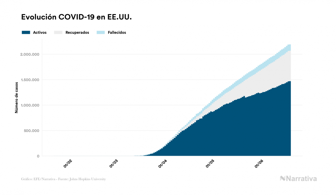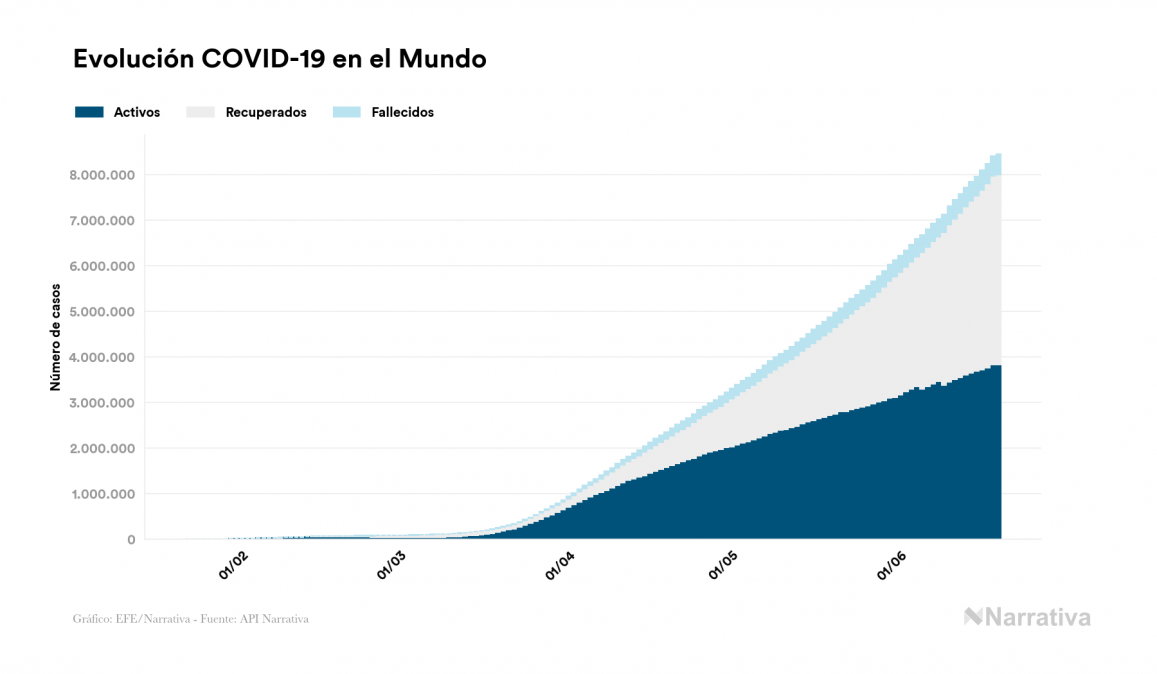 La cifra de casos por contagio por COVID-19 alcanza ya las 8.444.672 personas a nivel mundial, de las cuales 4.172.781 ya se han recuperado. EE.UU. concentra el mayor número de casos con 2.191.200, seguido de Brasil, Rusia y India con 978.142, 568.292 y 381.091 casos respectivamente.