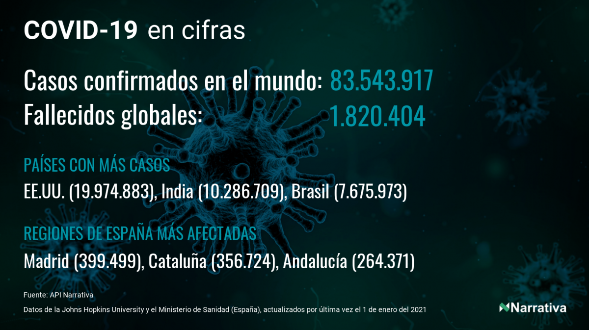 El número de casos confirmados de contagio por COVID-19 alcanza ya las 83.543.917 personas en todo el mundo, de las cuales ya se han recuperado 54.944.290. EE.UU. concentra el mayor número de casos con 19.974.883, seguido de India, Brasil y Rusia con 10.286.709, 7.675.973 y 3.153.960 casos respectivamente.