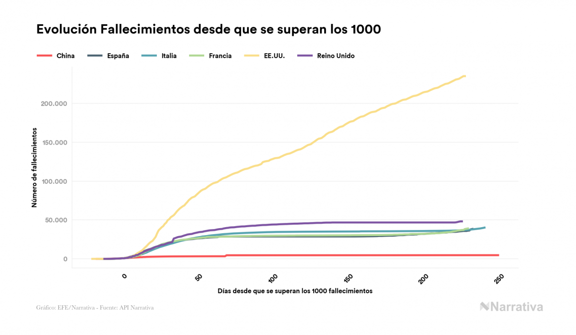Desde su aparición, el número de fallecidos a nivel mundial se sitúa actualmente en 1.235.335 personas, tras sumarse 3.704 nuevas muertes en el último recuento. EE.UU. es el país con mayor número de víctimas hasta el momento con 234.944 personas fallecidas, seguido de Brasil, India y México con 161.106, 125.032 y 93.772 fallecimientos respectivamente.