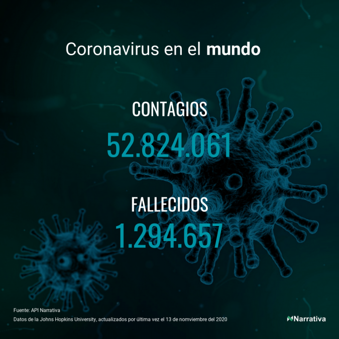 La cifra de casos por contagio por COVID-19 alcanza ya las 52.824.061 personas en todo el mundo, de las cuales 34.116.699 ya se han recuperado. EE.UU. concentra el mayor número de casos con 10.555.469, seguido de India, Brasil y Francia con 8.728.795, 5.781.582 y 1.915.282 casos cada uno.