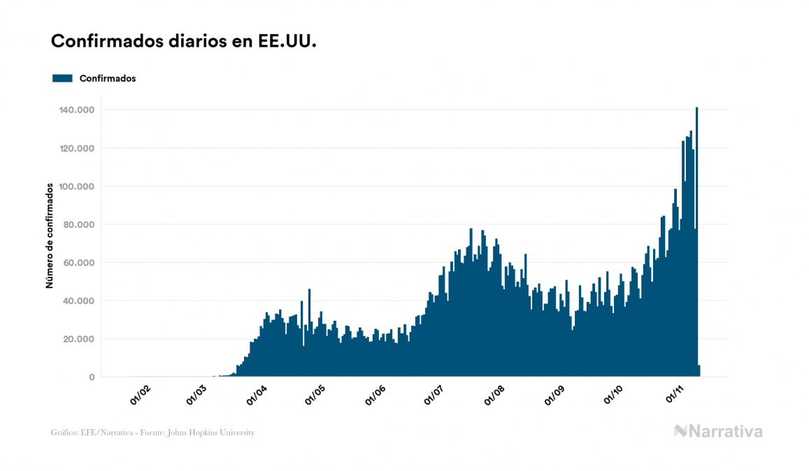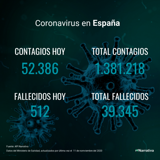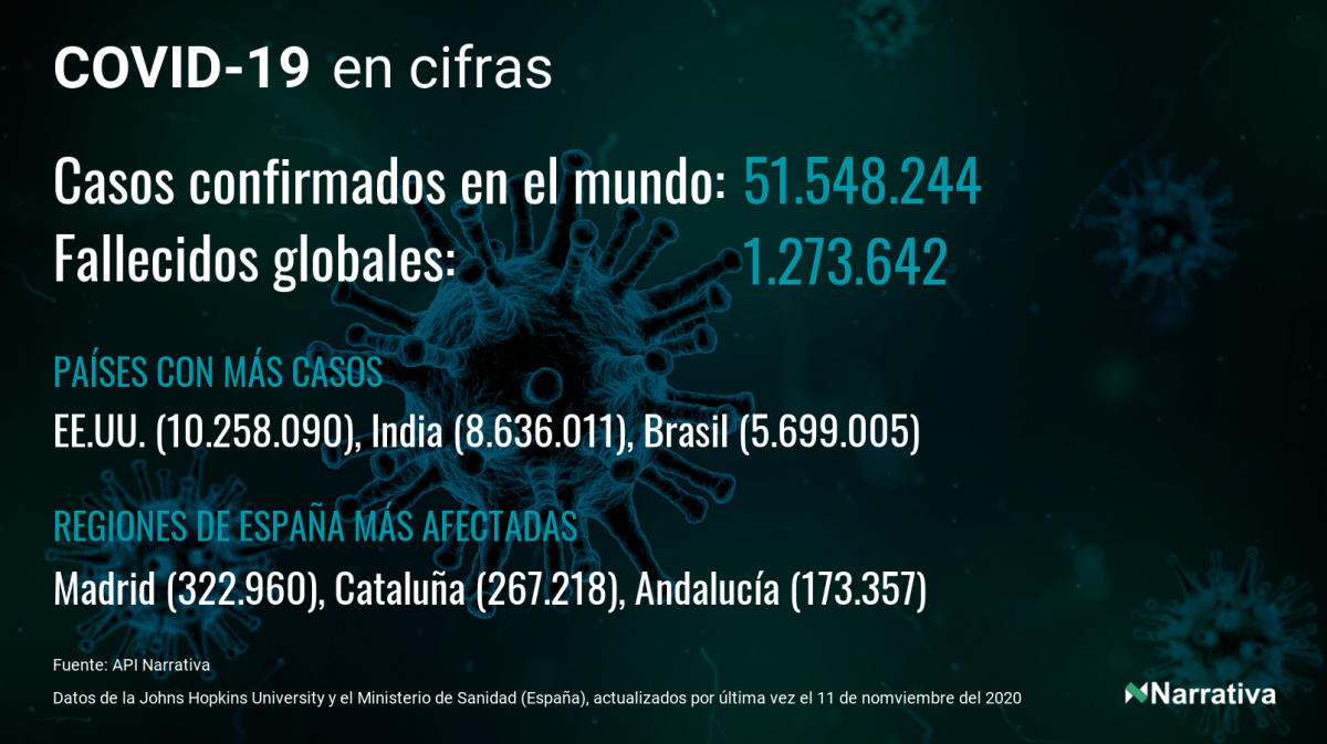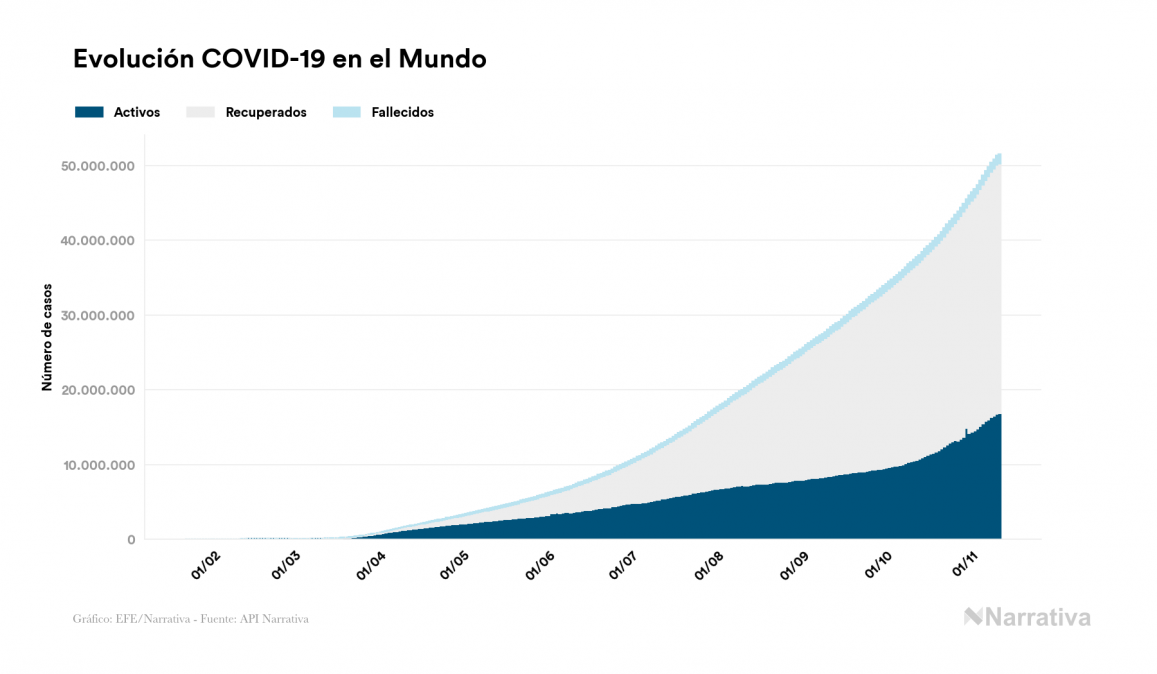 La cifra de casos por contagio por COVID-19 alcanza ya las 51.548.244 personas a nivel mundial, de las cuales ya se han recuperado 33.477.615. EE.UU. concentra el mayor número de casos con 10.258.090, seguido de India, Brasil y Francia con 8.636.011, 5.699.005 y 1.857.309 casos cada uno.