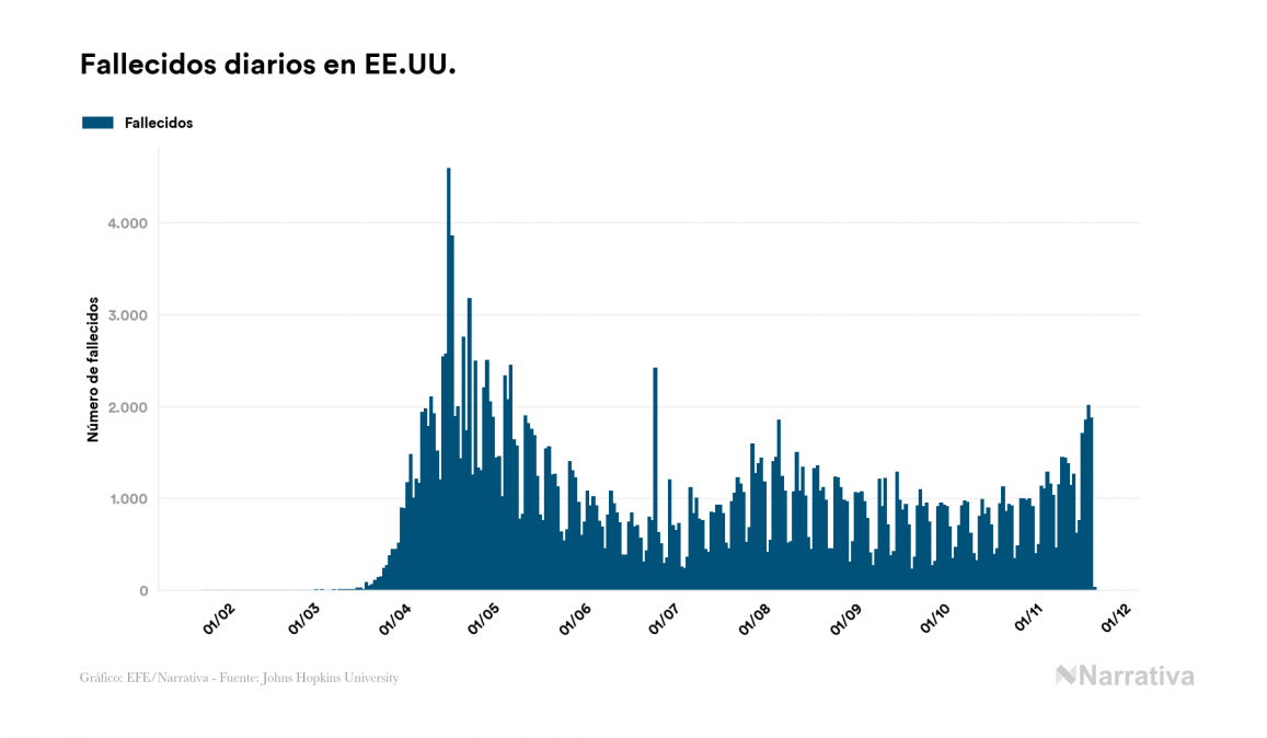 En total, el número de fallecidos a nivel mundial se sitúa actualmente en 1.374.547 personas, tras sumarse 4.423 nuevas muertes en el último recuento. EE.UU. es el país con mayor número de víctimas hasta el momento con 254.445 personas fallecidas, seguido de Brasil, India y México con 168.613, 132.726 y 100.823 fallecimientos respectivamente.