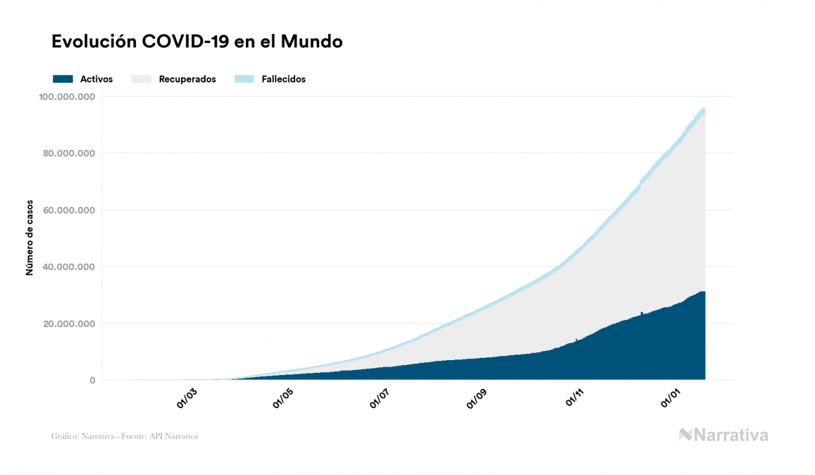 El número de casos confirmados de contagio por COVID-19 alcanza ya las 95.628.626 personas en todo el mundo, de las cuales ya se han recuperado 62.142.139. EE.UU. concentra el mayor número de casos con 24.079.205, seguido de India, Brasil y Rusia con 10.581.823, 8.511.770 y 3.574.330 casos cada uno.