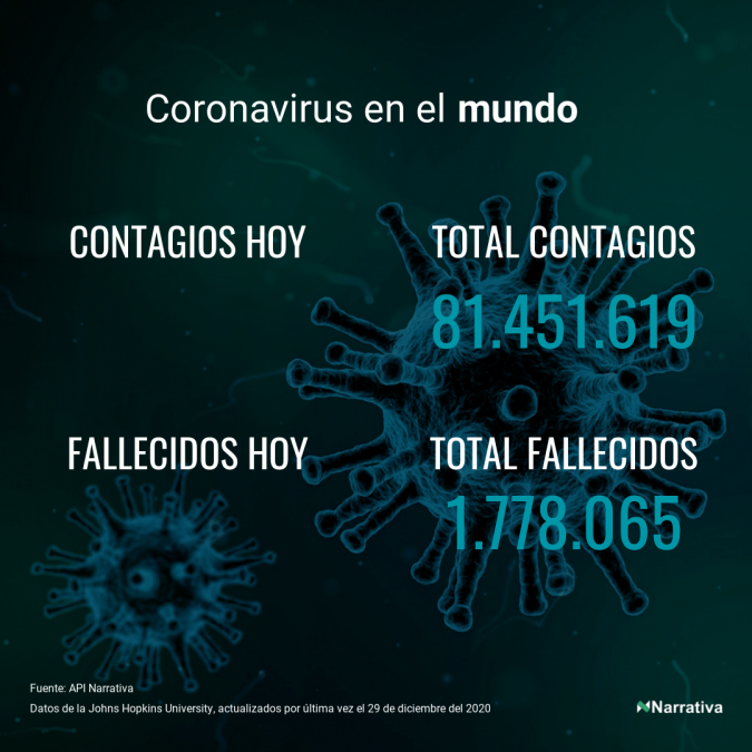 La cifra de casos por contagio por COVID-19 alcanza ya las 81.451.619 personas en todo el mundo, de las cuales 53.640.789 ya se han recuperado. EE.UU. concentra el mayor número de casos con 19.313.314, seguido de India, Brasil y Rusia con 10.224.303, 7.504.833 y 3.073.923 casos respectivamente.