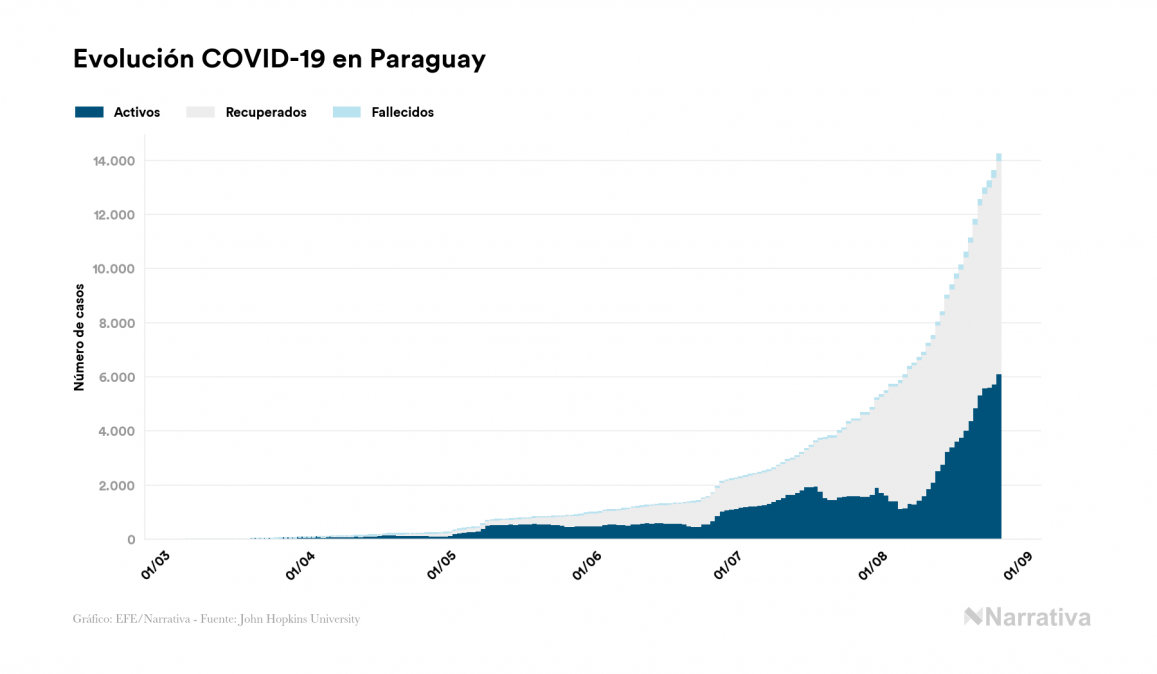 Según los últimos datos, actualmente en Paraguay hay 6.114 casos activos de COVID-19 tras confirmarse 626 nuevos positivos y 234 altas médicas este miércoles. Desde el comienzo de la pandemia, la cifra total de contagiados asciende a 14.228, con 7.883 recuperados y 231 fallecidos.