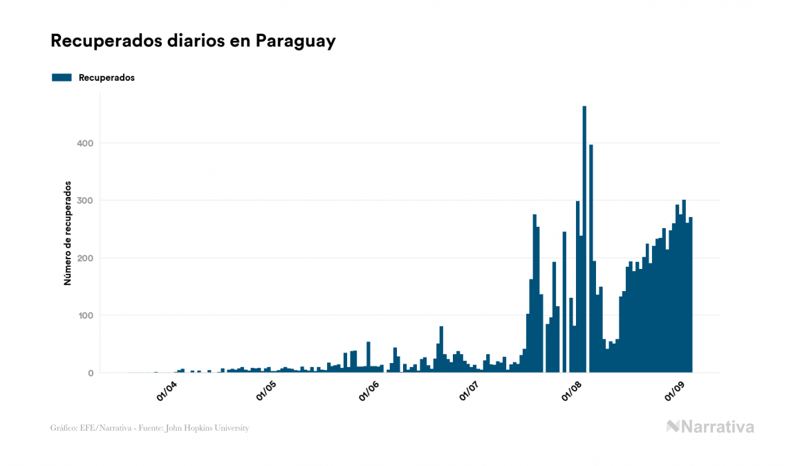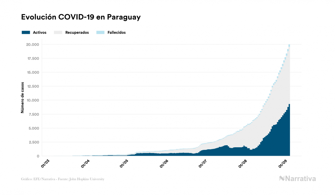 Según los últimos datos, actualmente en Paraguay hay 9.335 casos activos de COVID-19 tras confirmarse 821 nuevos positivos y 270 altas médicas este viernes. Desde el comienzo de la pandemia, el número total de contagiados asciende a 19.959, con 10.251 recuperados y 373 fallecidos.