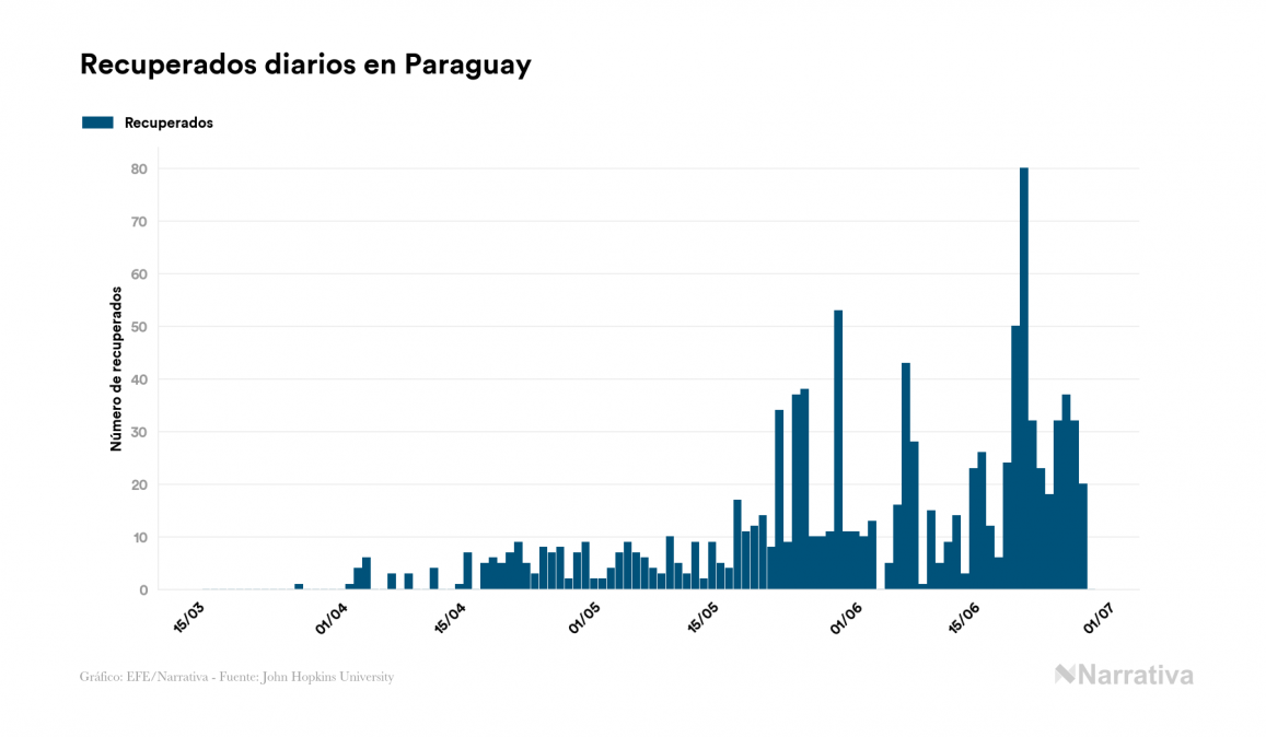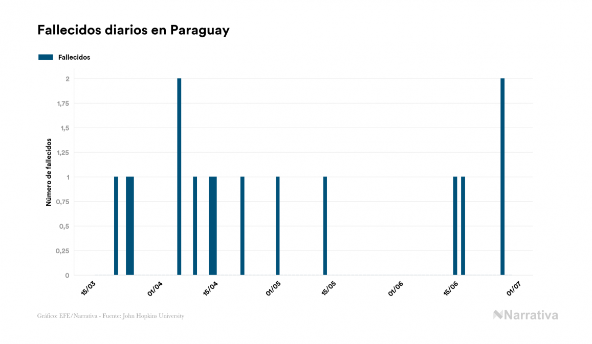 El nuevo coronavirus deja ya 2.127 casos de contagio en Paraguay, con 1.047 de ellos actualmente activos y 15 fallecidos, según los últimos datos correspondientes al 29 de junio. Además, un total de 1.065 personas ya se ha recuperado desde que se produjo el primer contagio en el país.
