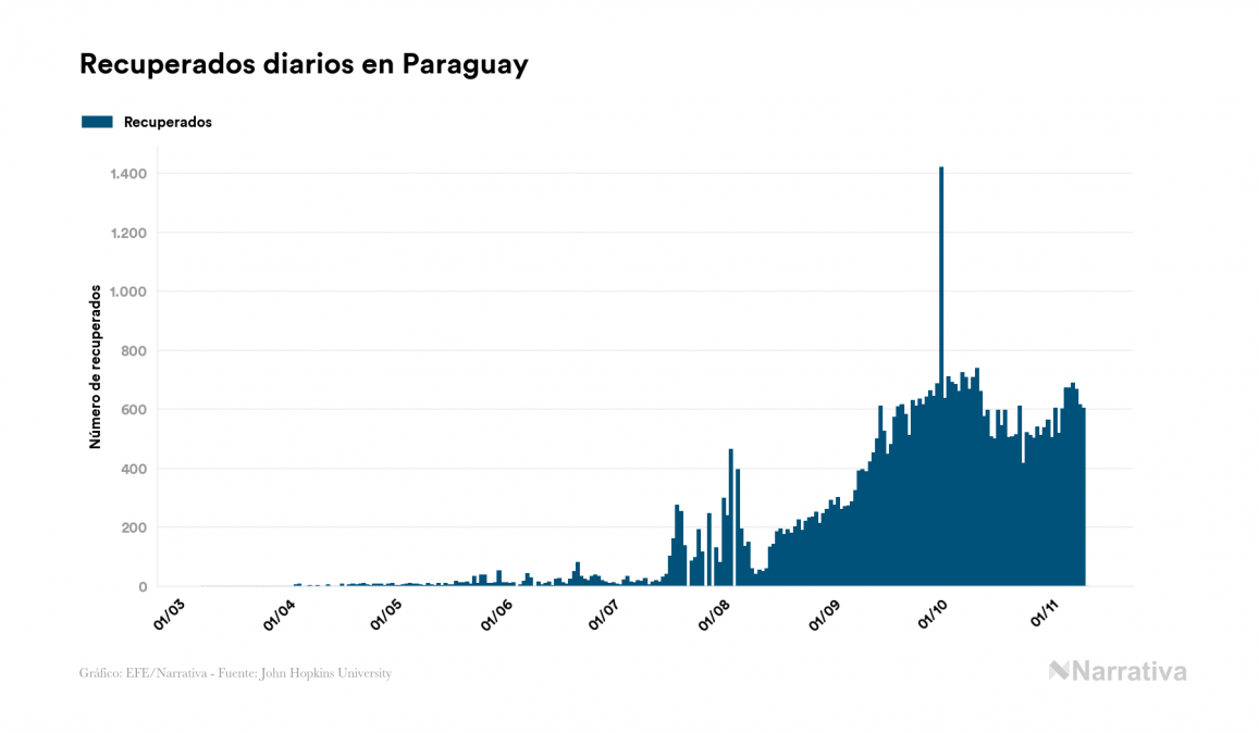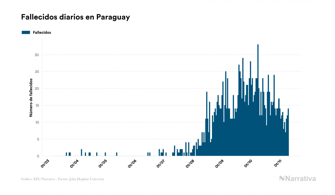 El coronavirus deja ya 68.497 casos de contagio en Paraguay, con 17.942 de ellos actualmente activos y 1.516 fallecidos, según los últimos datos correspondientes al 11 de noviembre. Además, un total de 49.039 personas ya se ha recuperado desde que se produjo el primer contagio en el país.