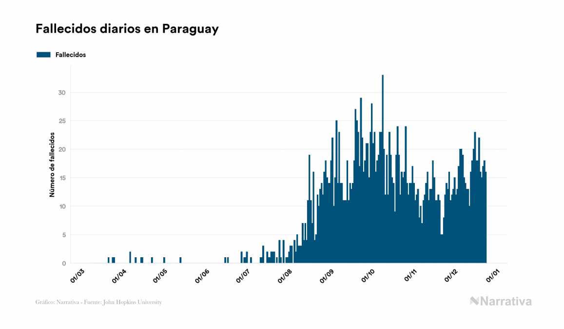 La COVID-19 deja ya 103.329 casos de contagio en Paraguay, con 25.666 de ellos actualmente activos y 2.154 fallecidos, según los últimos datos correspondientes al 25 de diciembre. Además, un total de 75.509 personas ya se ha recuperado desde que se produjo el primer contagio en el país.